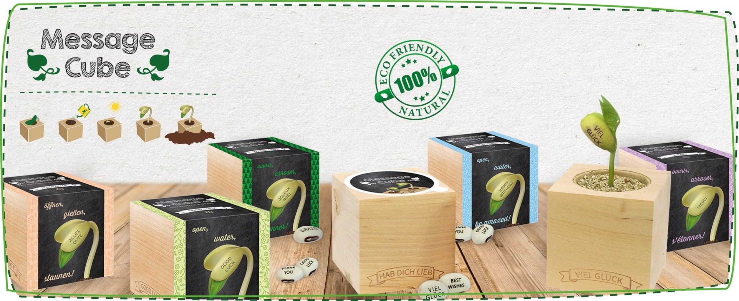 Message Cube zawiera laserowaną fasolę, tak zwaną kanawalię mieczokształtną, w której wygrawerowano życzenia, oraz specjalne granulki do uprawy.