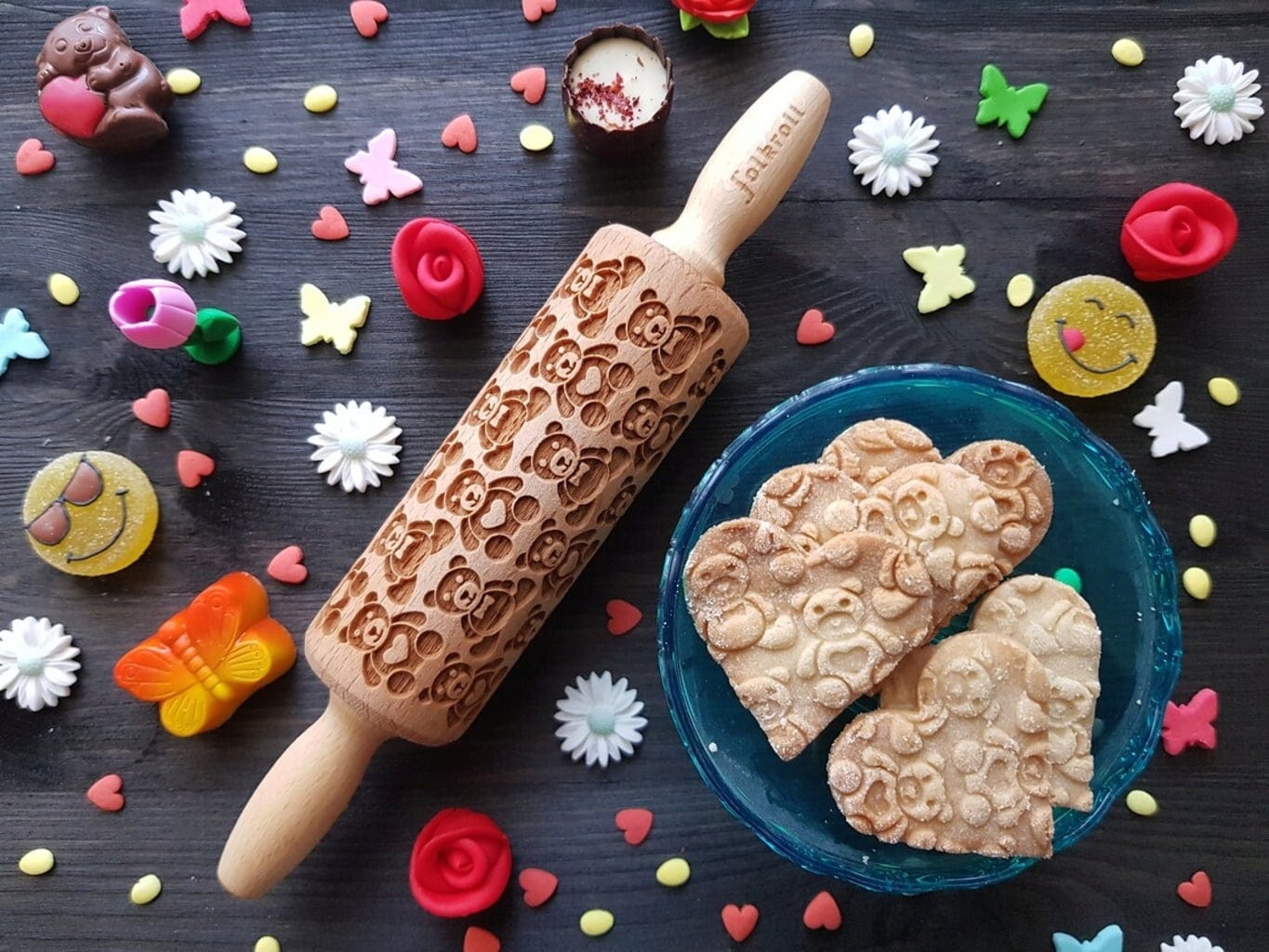 Niezliczona ilość uroczych, pluszowych misiów zdobi ten wysokiej jakości wałek z drzewa bukowego. Idealny dla małych smakoszy, którzy lubią nie tylko podjadać, ale również pomagać w kuchni. Zastosowanie jest bardzo proste: rozwałkuj ciasto, a następnie pokrój lub wytnij wybrany przez Ciebie kształt, upiecz, gotowe!