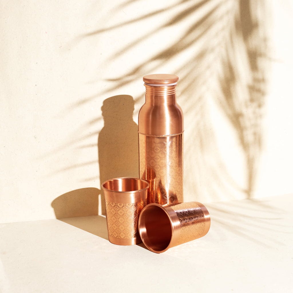 Inspirowany pałacową stolarką, ten urzekający projekt zachwyca delikatnością, podkreśloną miedzianym połyskiem. Butelka i dwa kubki są ręcznie robionymi, unikalnymi przedmiotami i urzekają swoim geometrycznym pięknem. Kolekcja miedziana to piękny prezent.