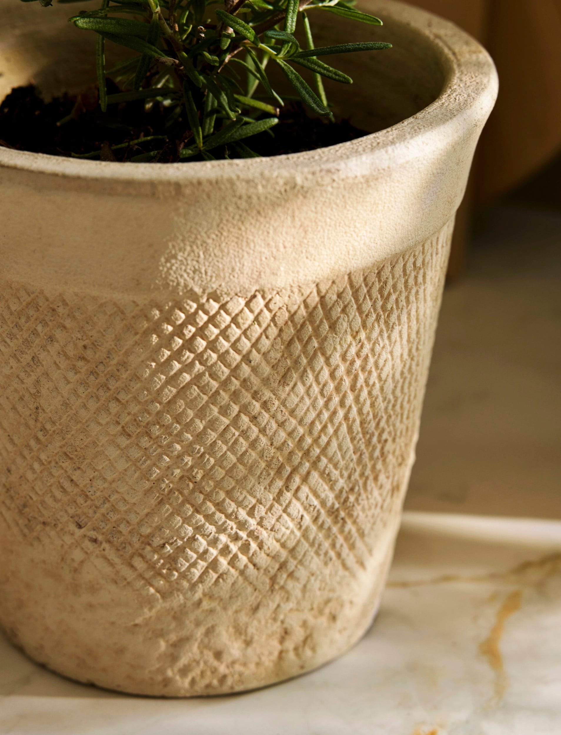 Dyskretnie teksturowana kamienna powierzchnia nadaje tej doniczce atrakcyjny wygląd, a wodoodporne wnętrze zapewnia roślinom optymalny rozwój. Idealna do małych ziół, sukulentów lub miniaturowych kompozycji kwiatowych, doniczka ta przekształca codzienną zieleń w wyrafinowany design.
