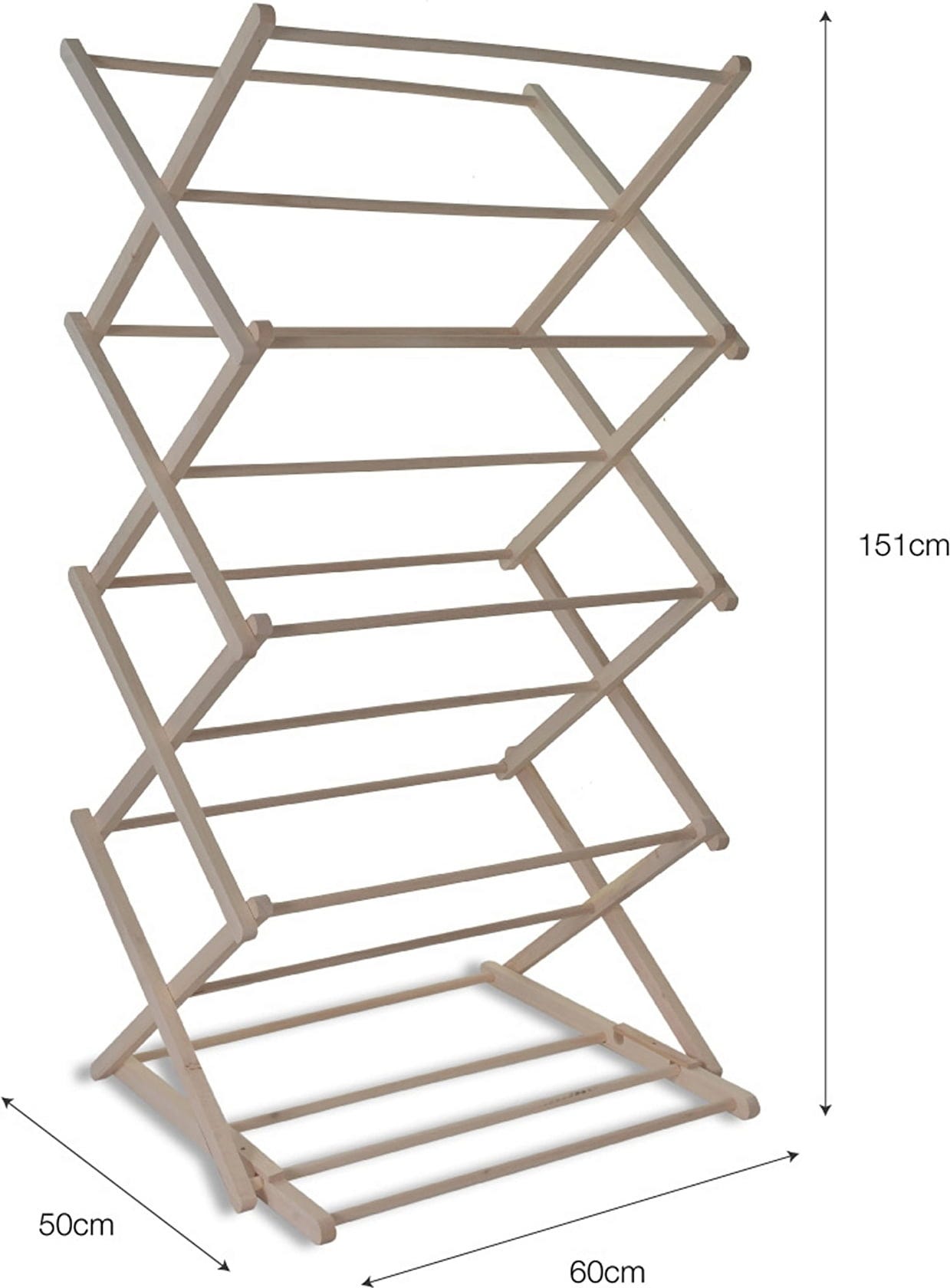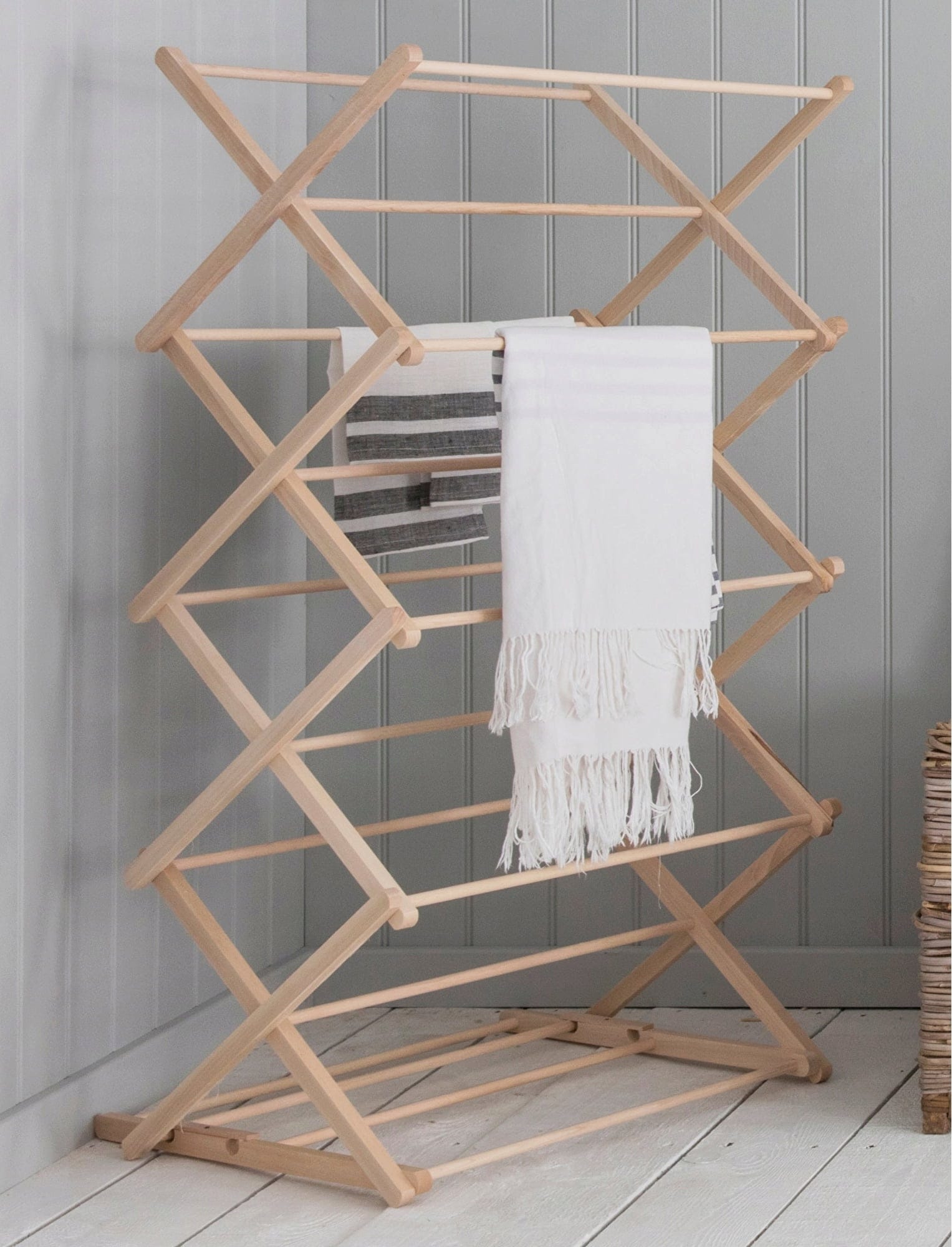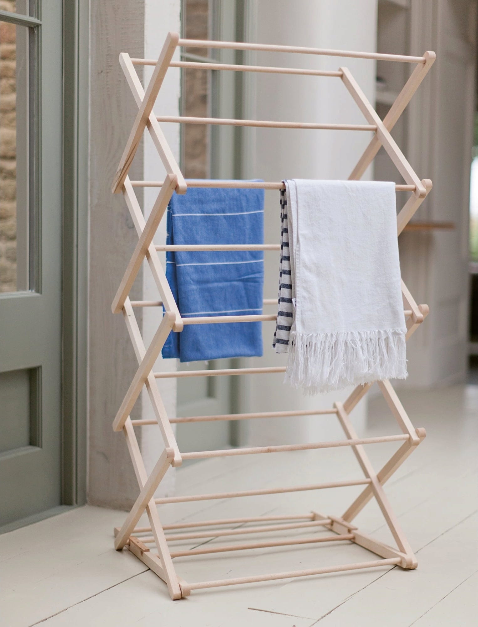 Ta suszarka wykonana z wysokiej jakości drewna bukowego jest wyjątkowo stylowym dodatkiem do Twojego domu. Dwie różne wysokości pozwalają dostosować suszarkę do dokładnej ilości prania i dostępnej przestrzeni. Przechowywanie jest również bardzo łatwe: po wysuszeniu prania można po prostu złożyć suszarkę i schować ją, aby zaoszczędzić miejsce.