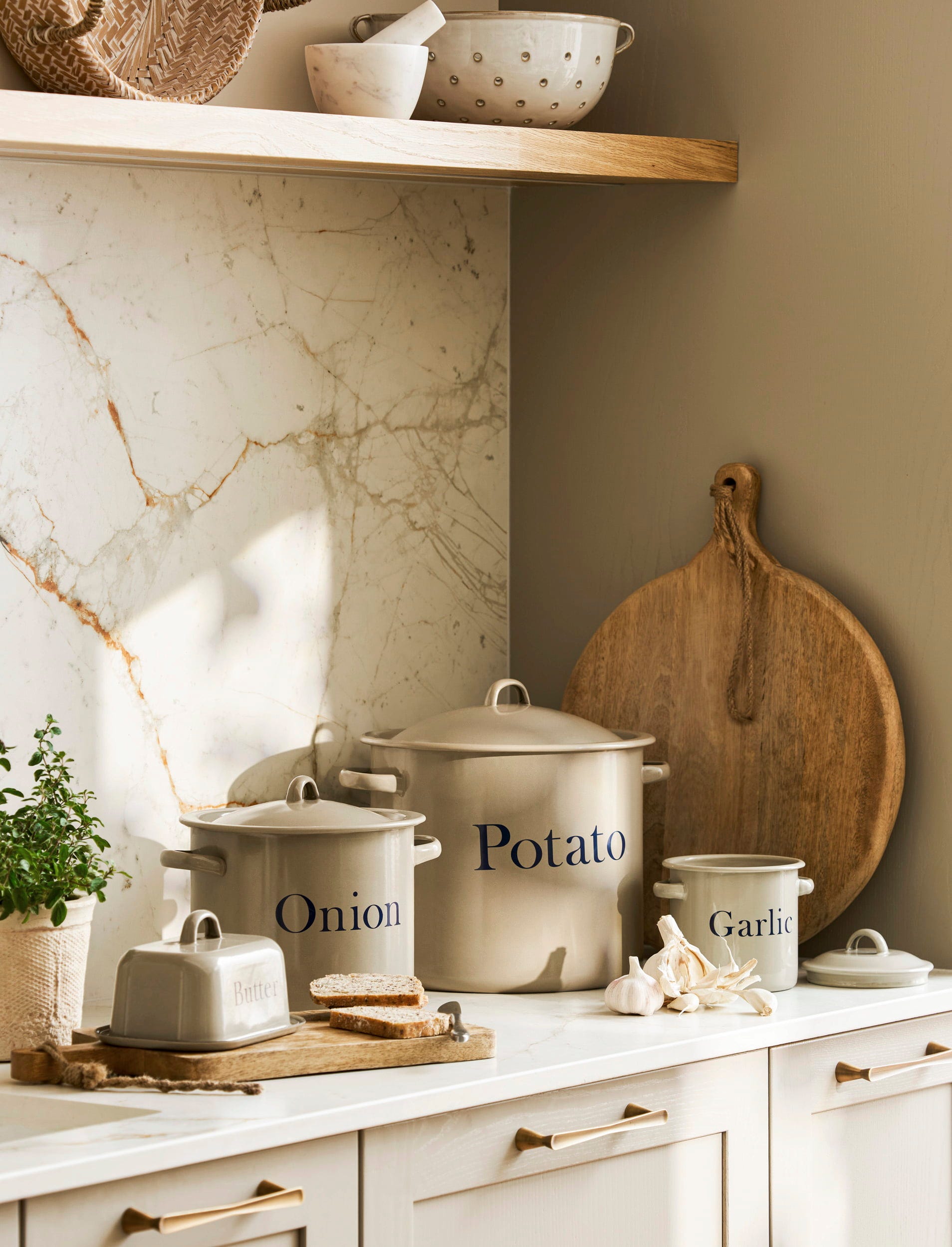 Wyposażony w pokrywkę i dwa uchwyty, pojemnik ten zachwyca klasycznym designem w ciepłym kolorze "Truffle" i oferuje mnóstwo miejsca na całe główki czosnku, a także pojedyncze ząbki, dzięki czemu pozostają one świeże przez długi czas. To wyjątkowo estetyczny sposób na uporządkowanie spiżarni.