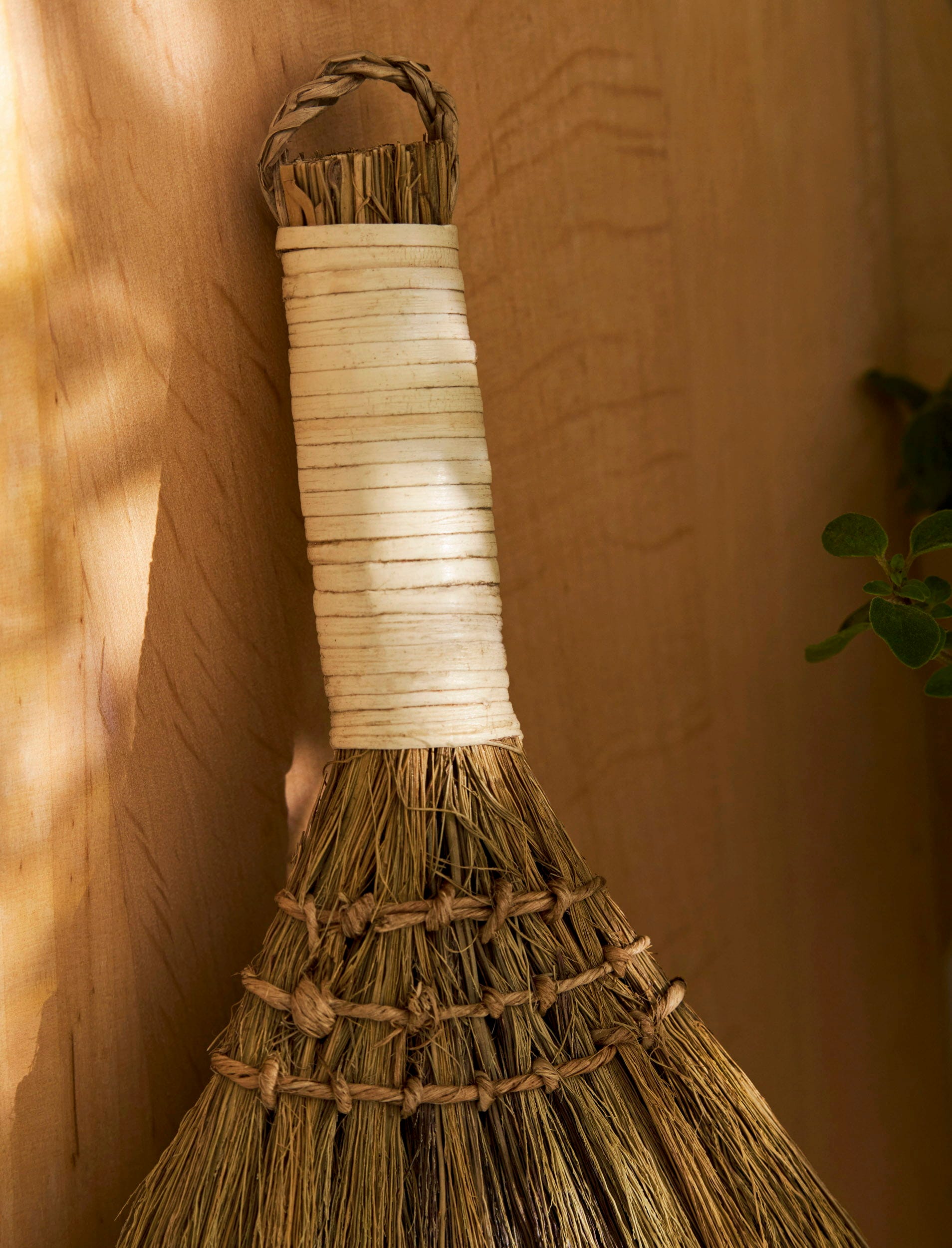 Ta miotła stołowa to stylowy sposób na zamiatanie okruchów z blatów i powierzchni kuchennych. Wykonana jest z naturalnej trawy morskiej i ma owinięty uchwyt oraz praktyczną pętelkę do zawieszania. Gdy nie jest używana, można ją zawiesić na haczyku w kuchni lub pomieszczeniu gospodarczym, aby zaoszczędzić miejsce i dodać dekoracyjny akcent.