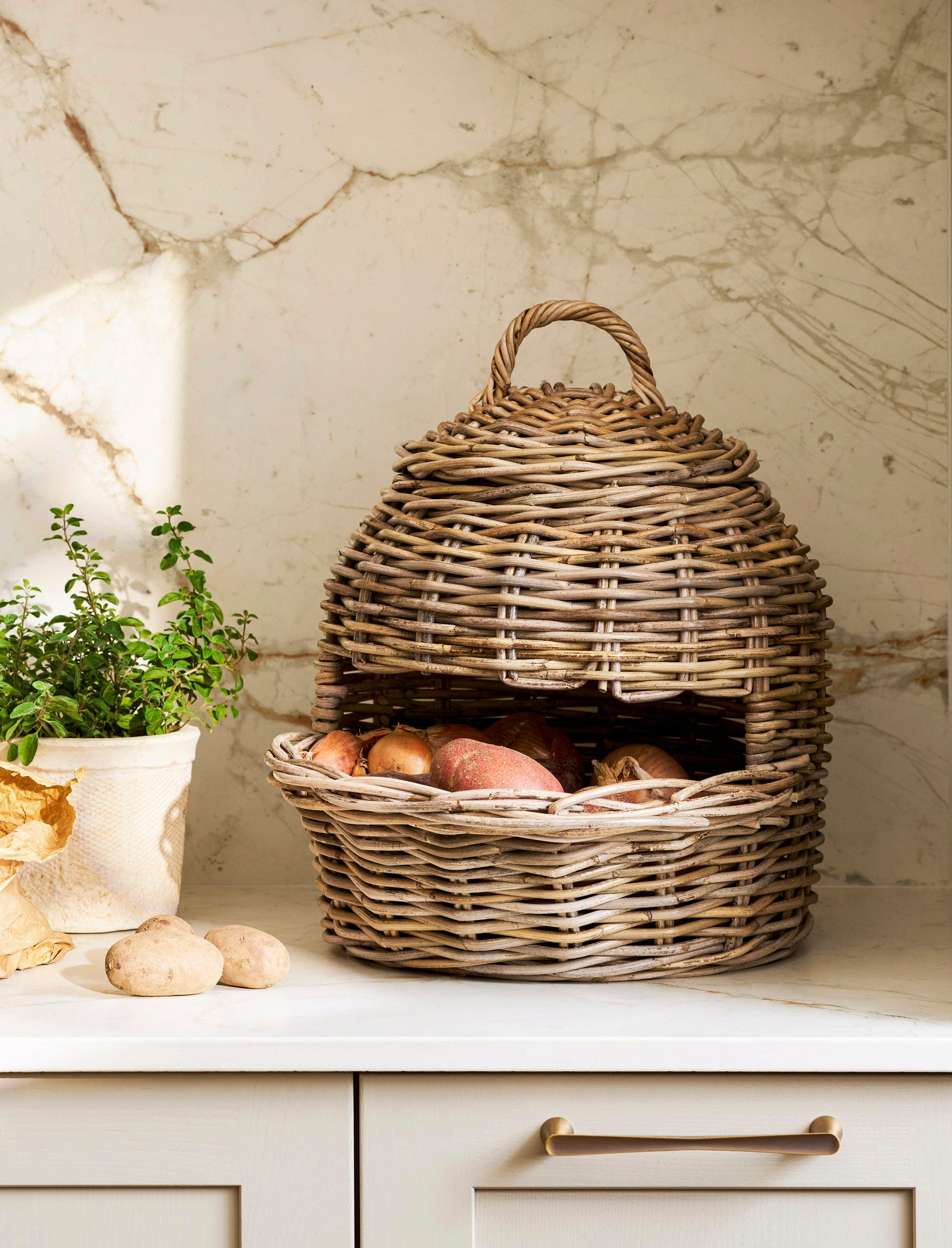 Idealny do przytulnej wiejskiej kuchni: ten kosz na warzywa jest idealny do przechowywania warzyw, takich jak ziemniaki, cebula i marchew. Ręcznie wyplatany z rustykalnego rattanu, stanowi wizualne wzbogacenie każdej spiżarni lub kuchni.
