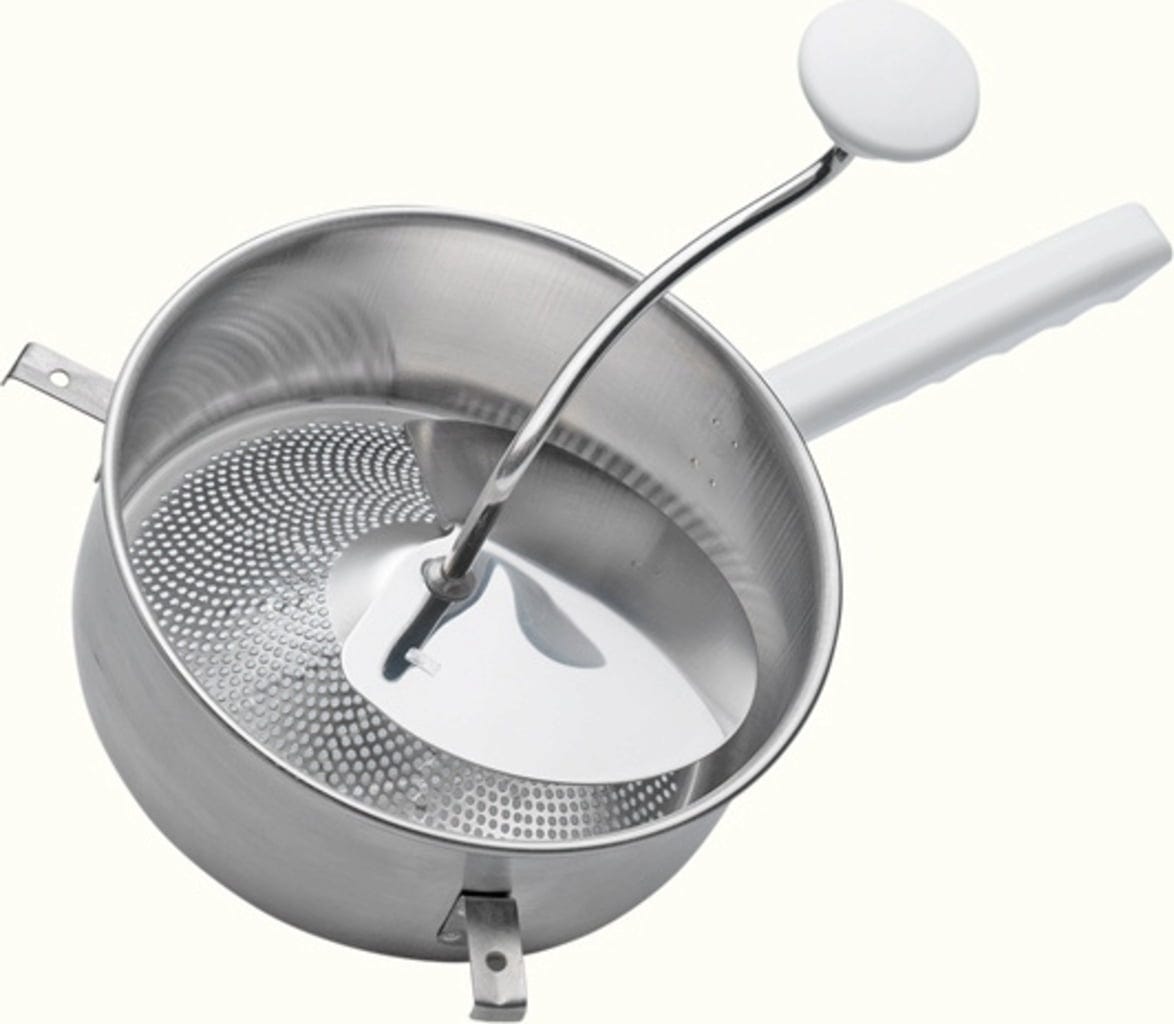 Dzięki pojemności 1,5 litra można z łatwością przetwarzać większe ilości. Szczególną zaletą jest opatentowana funkcja skrobaka, która zapewnia, że odcedzona żywność jest czysto i całkowicie wyciskana przez 2 mm perforacje. Solidne urządzenie wykonane z wysokiej jakości stali nierdzewnej i tworzywa sztucznego to trwały klasyk, który będzie Ci towarzyszył przez wiele lat i oczywiście można go myć w zmywarce w celu łatwego czyszczenia.