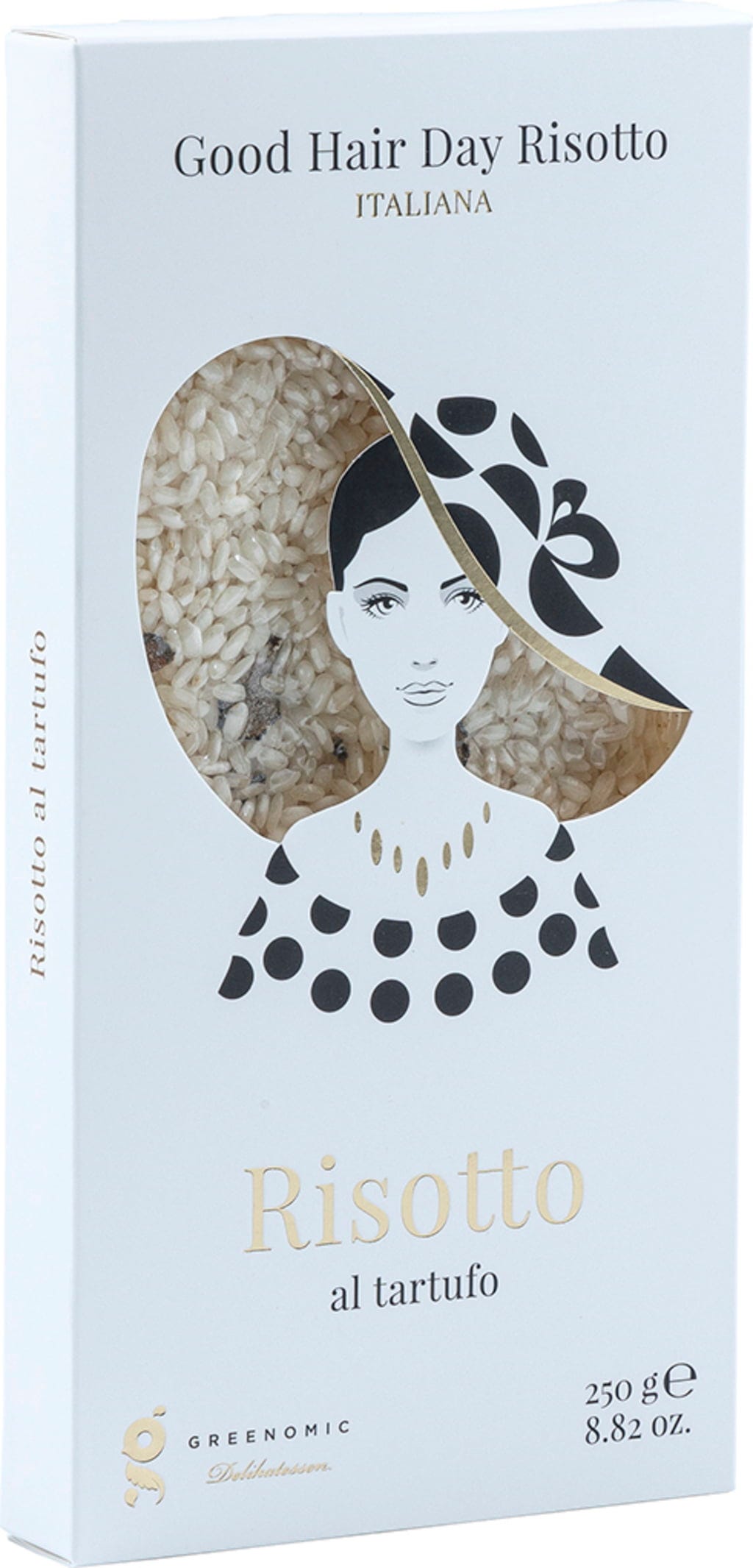 Risotto al tartufo - ryż arborio z letnią truflą. Wyprodukowano we Włoszech i kreatywnie zapakowano w stylu Good Hair Day Risotto.