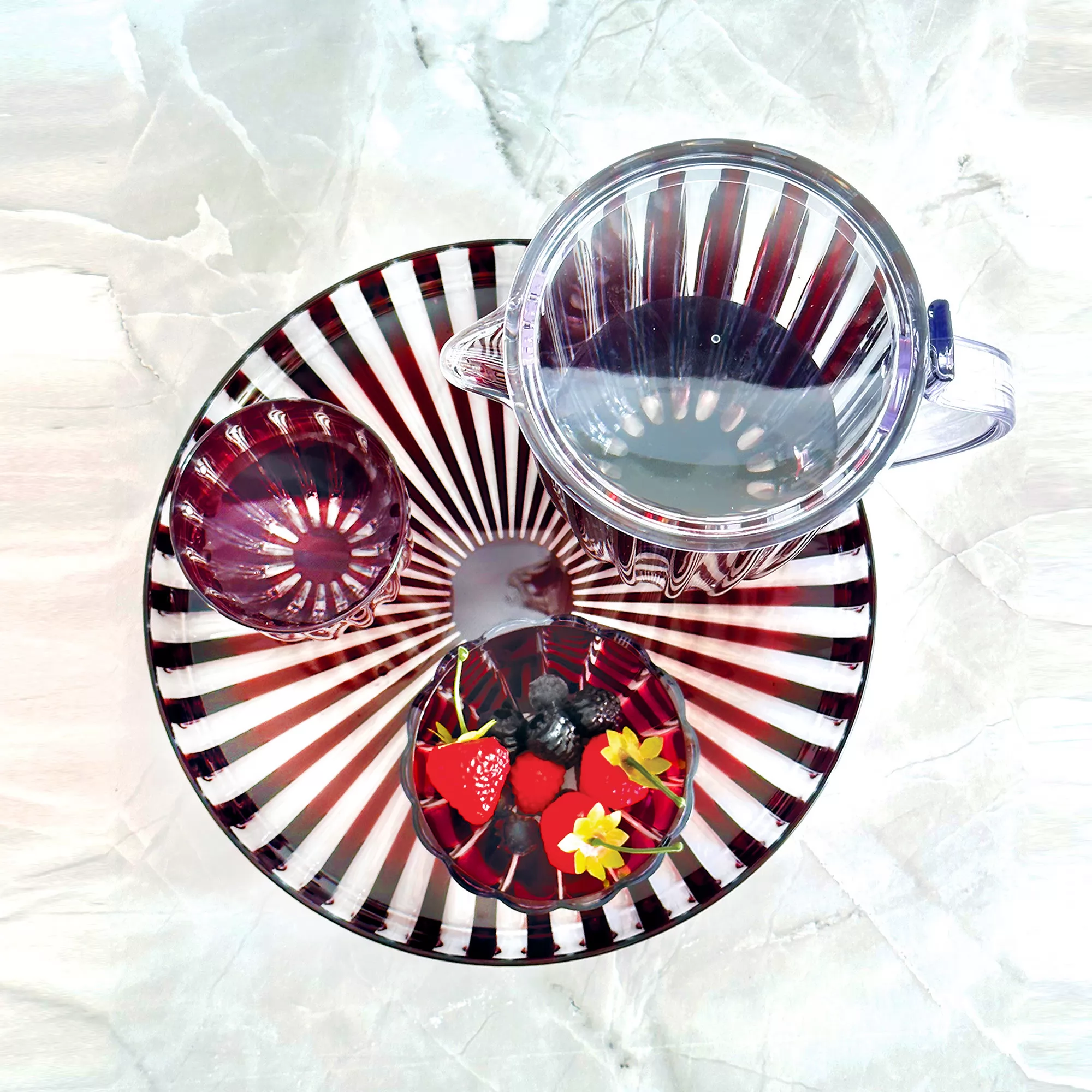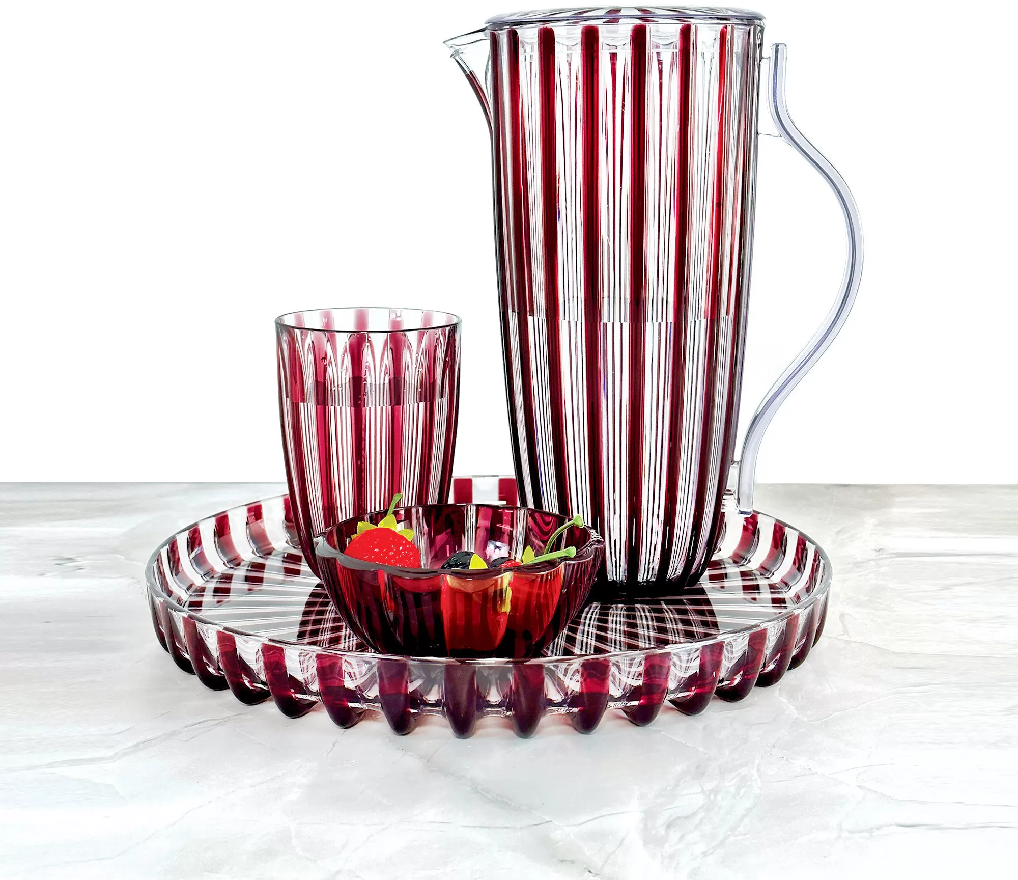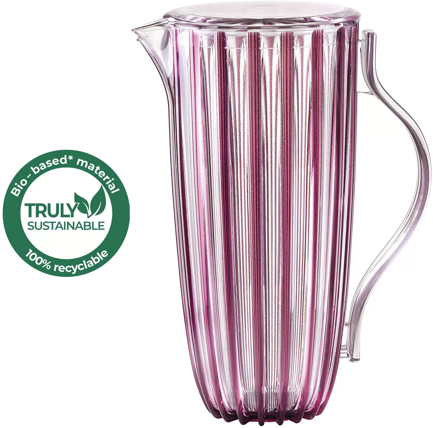 Świeże, żywe kolory, elegancko zakrzywiony uchwyt i elegancki wzór rowków charakteryzują ten dzbanek. Ma on dużą pojemność 1,75 litra i praktyczną pokrywkę i jest idealny do serwowania chłodnych napojów i dostarczania pysznych przekąsek, a także jako wizualna atrakcja na stole w jadalni.