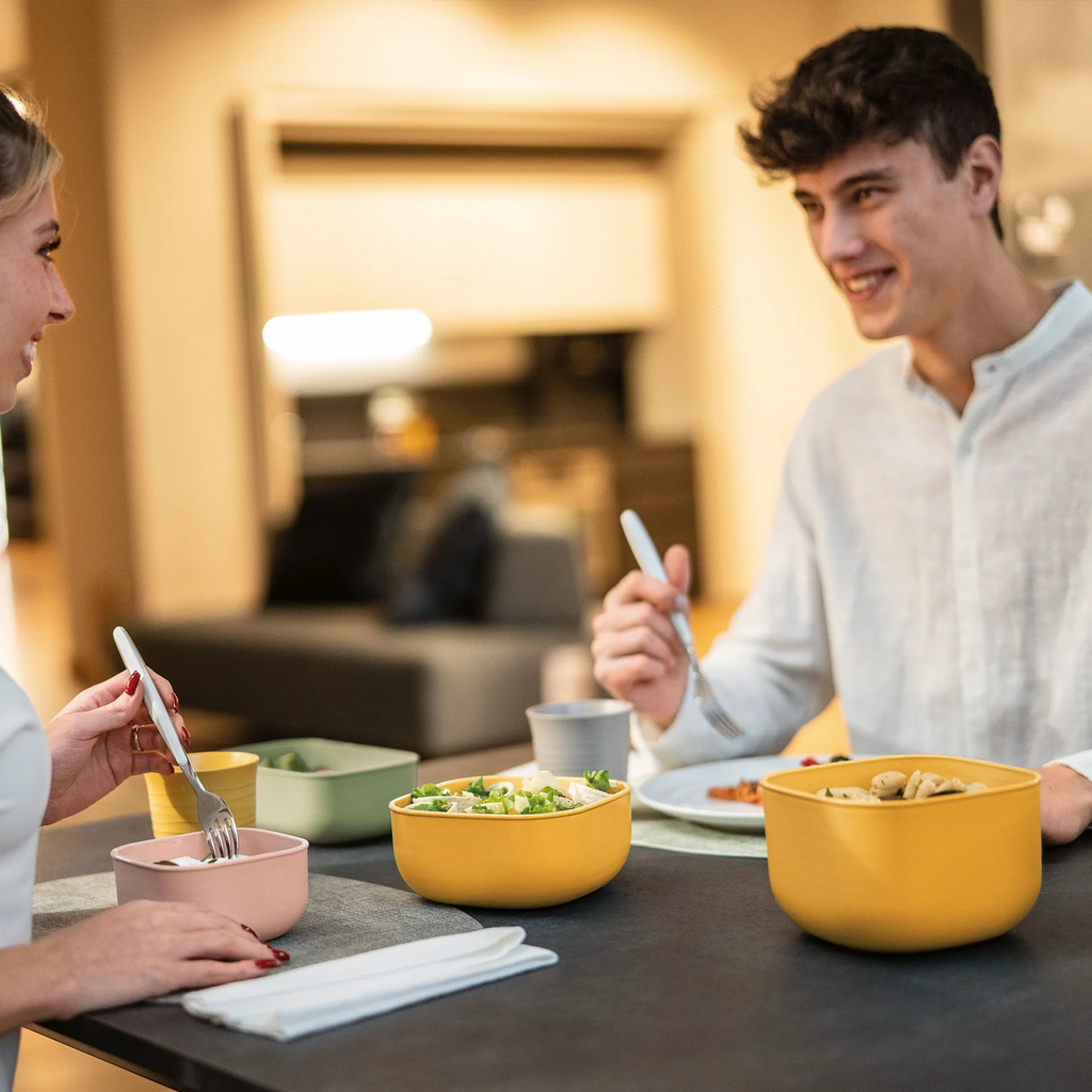 Materiał: bioplastik bez BPA wykonany z odpadów roślinnych (pojemnik), bezpieczny dla żywności silikon (pokrywka)