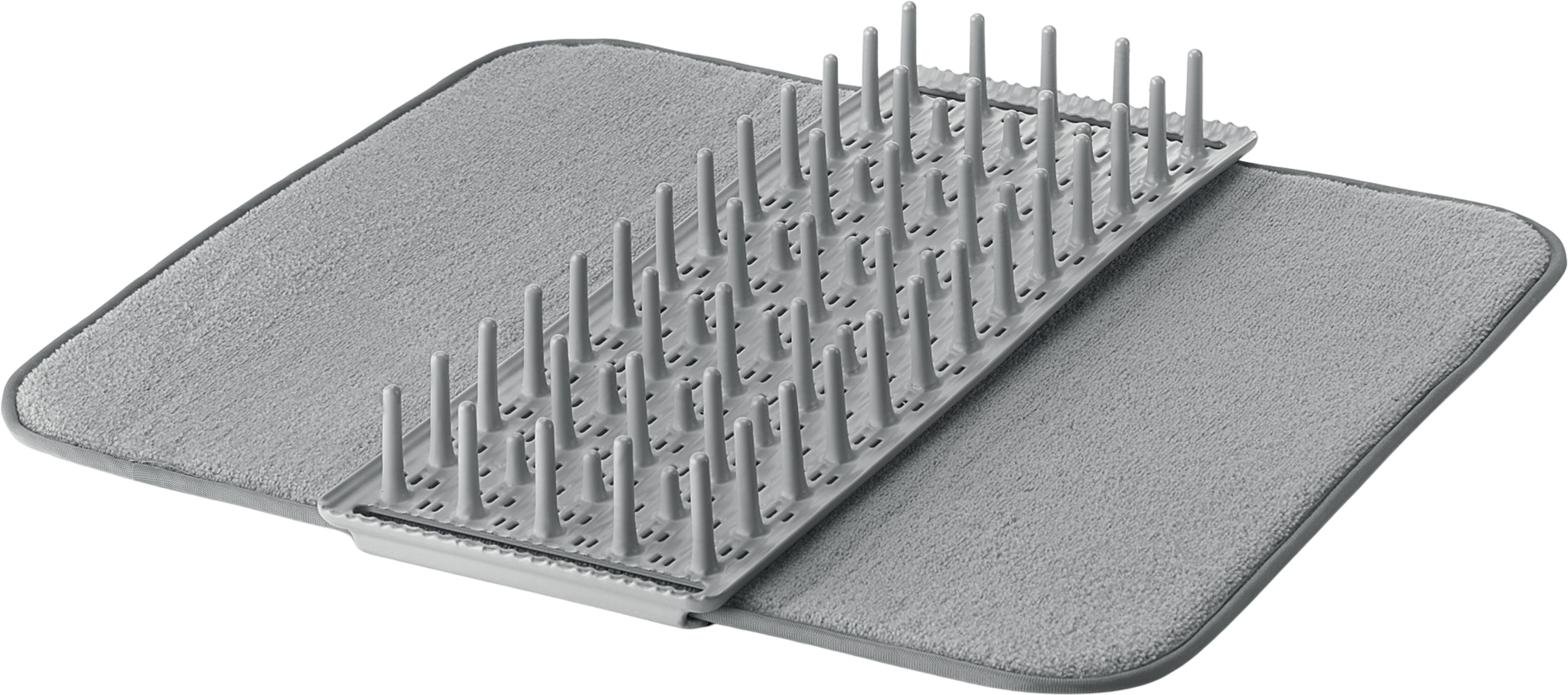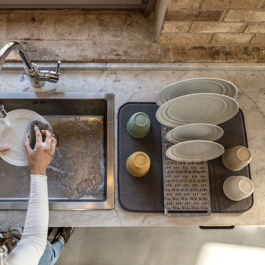 Miękka mata szybko wchłania nadmiar wody, jednocześnie chroniąc zlew i naczynia przed uderzeniami i nieestetycznymi zadrapaniami. A ponieważ wygoda jest ważna, ociekacz można łatwo zdemontować. Koszyk można wygodnie włożyć do zmywarki, a mata odzyska świeżość w pralce.