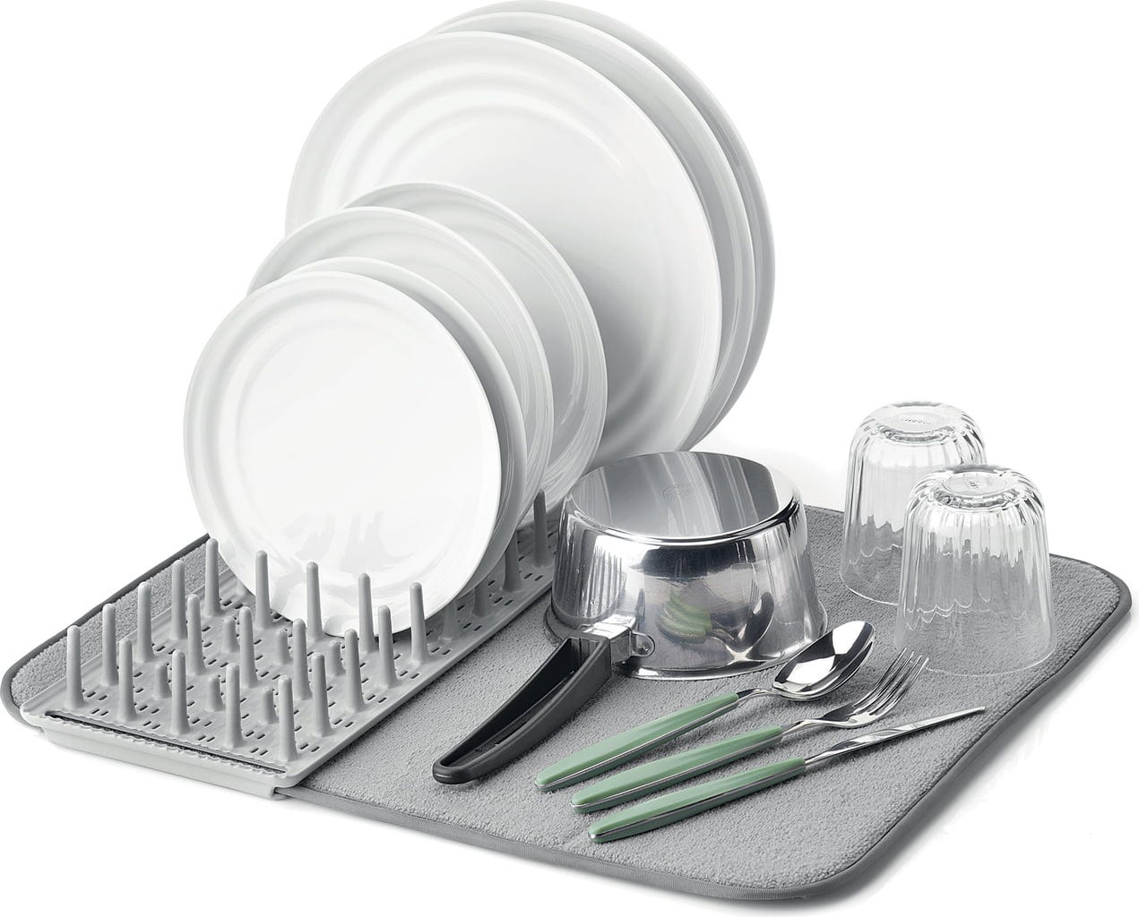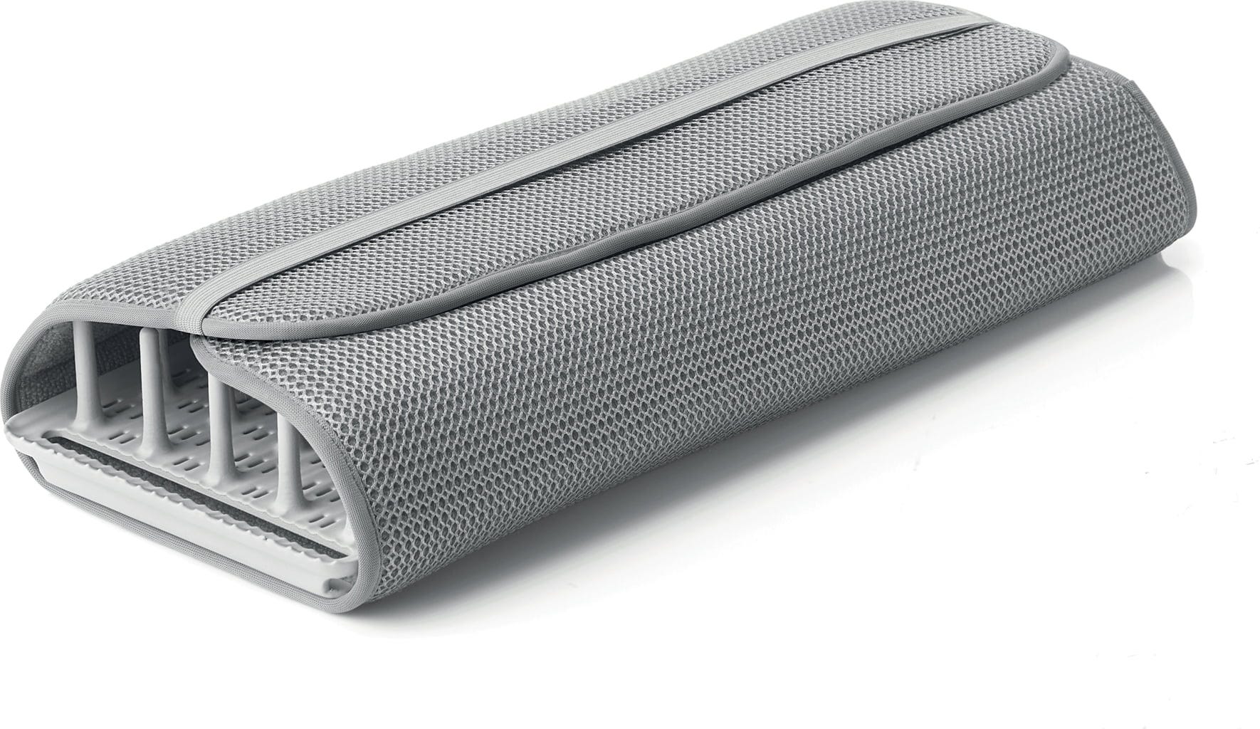 Jeśli ociekacz nie jest w danej chwili potrzebny, można go schować, aby zaoszczędzić miejsce w mgnieniu oka. Wystarczy owinąć matę wokół stojaka i zabezpieczyć wszystko zintegrowaną gumką. W ten sposób znacznie zmniejsza się rozmiar i można go łatwo przechowywać w szafce lub pod zlewem.