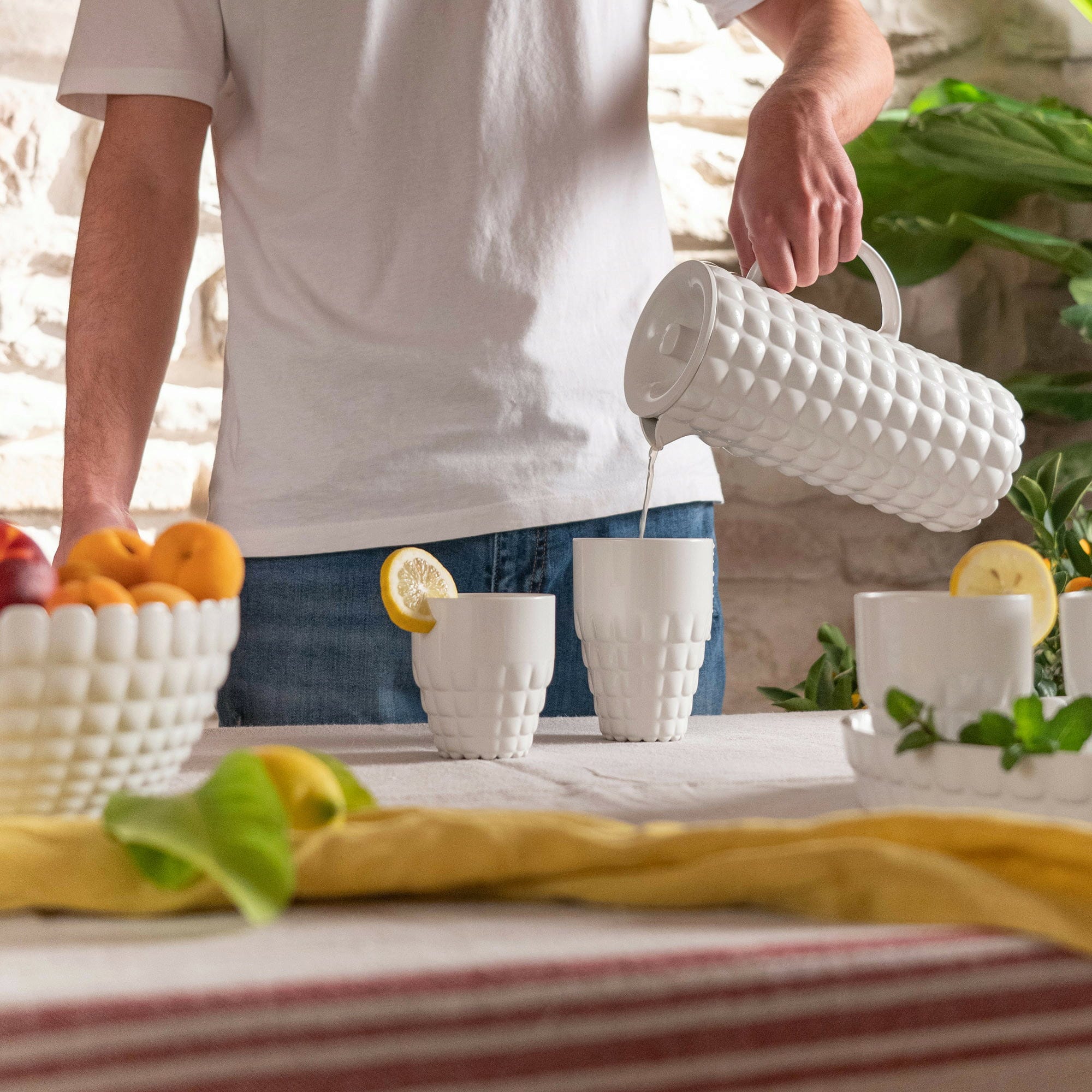 Ta piękna karafka z pokrywką nie tylko stanowi wizualny akcent, ale jest również nieporównywalnie praktyczna. Wykonana z wysokiej jakości, wytrzymałego akrylu, jest wyjątkowo lekka i dlatego idealnie nadaje się na balkony, tarasy i ogrody. Jej atrakcyjny, teksturowany design, który przypomina ołowiany kryształ lub porcelanę, sprawia, że jest to również atrakcja na stole.