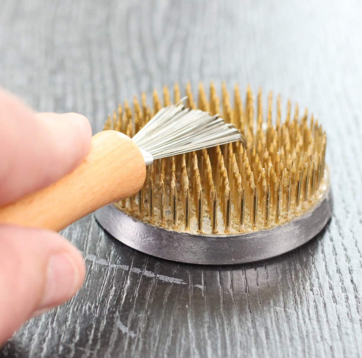 Po użyciu Kenzana wystarczy użyć szczotki Fakir pod bieżącą wodą i ostrożnie wyszczotkować igły żołędzi kwiatowych. To niezawodnie usuwa pozostałości kwiatów i brud. Następnie spłucz krótko i pozostaw do wyschnięcia. Aby uzyskać wyjątkowo błyszczący efekt, metalową podstawę można również wypolerować za pomocą szczotki.