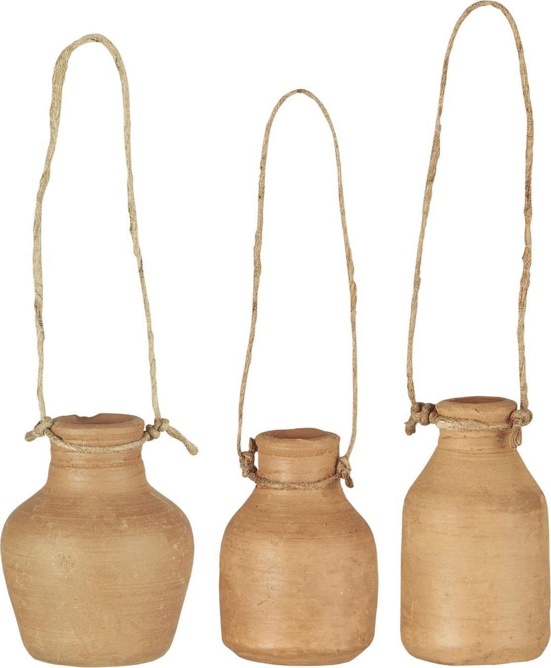 Te trzy małe wiszące butelki dodają delikatnego, ale efektownego akcentu do Twojego domu i idealnie nadają się do ozdabiania świeżymi lub suszonymi kwiatami. Butelki zostały wykonane z naturalnej gliny w prawdziwej pracy ręcznej - każdy egzemplarz jest niepowtarzalny.