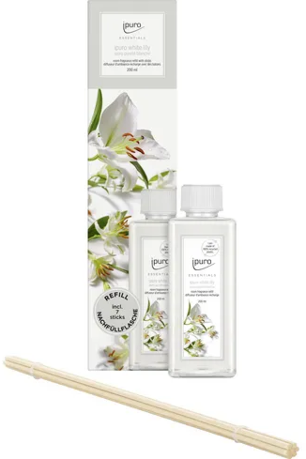 Dzięki temu praktycznemu wkładowi zapach do pokoju ipuro można uzupełnić w mgnieniu oka! Oprócz 7 nowych drewnianych patyczków zawiera również 200 ml zapachu do pomieszczeń White Lily.