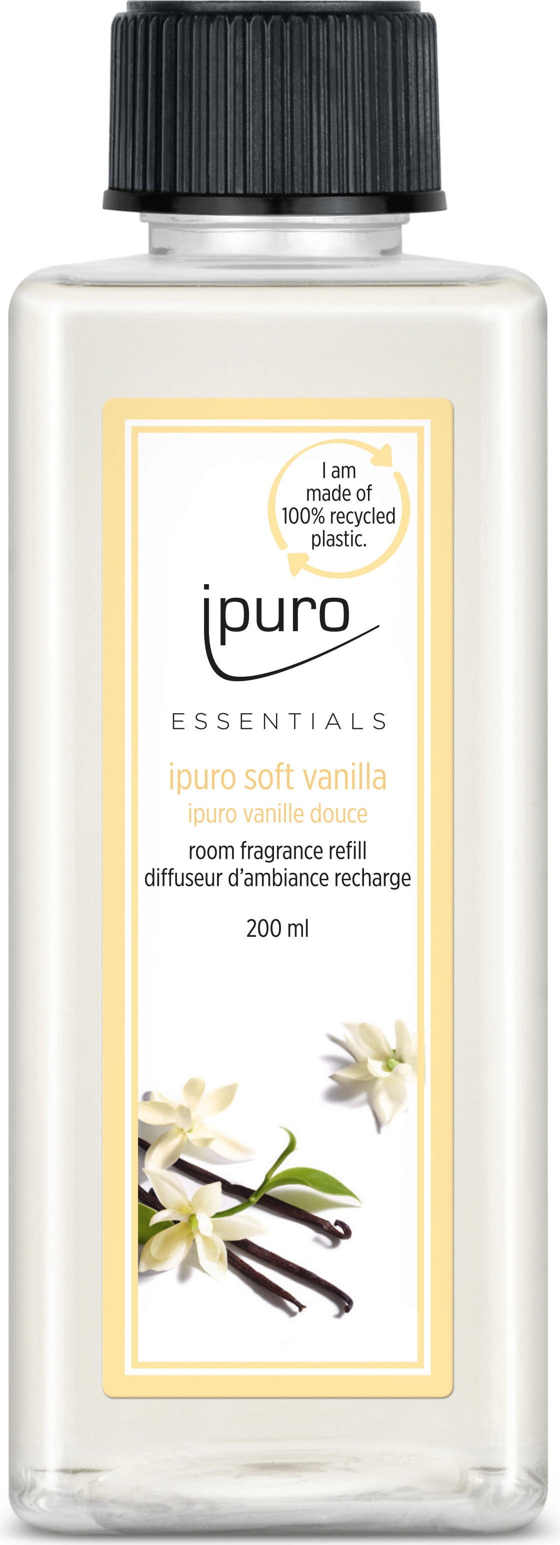 Wkład zapachowy do zapachu do pomieszczeń ipuro Essentials Soft Vanilla. Bergamotka i wanilia, kwiatowe akcenty, a także karmel, wanilia, fasola tonka i paczula tworzą ciepły, miękki waniliowy zapach.
