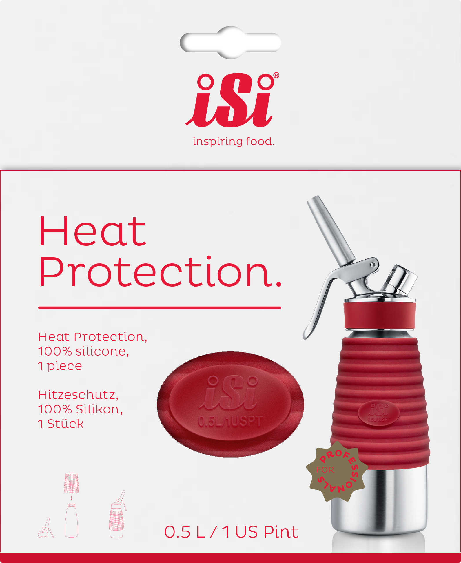 Silikonowy rękaw chroni dłonie podczas używania butelki ze stali nierdzewnej iSi na gorąco. Urządzenie iSi powinno być podgrzane do maksymalnie 75°C podczas stosowania na gorąco.