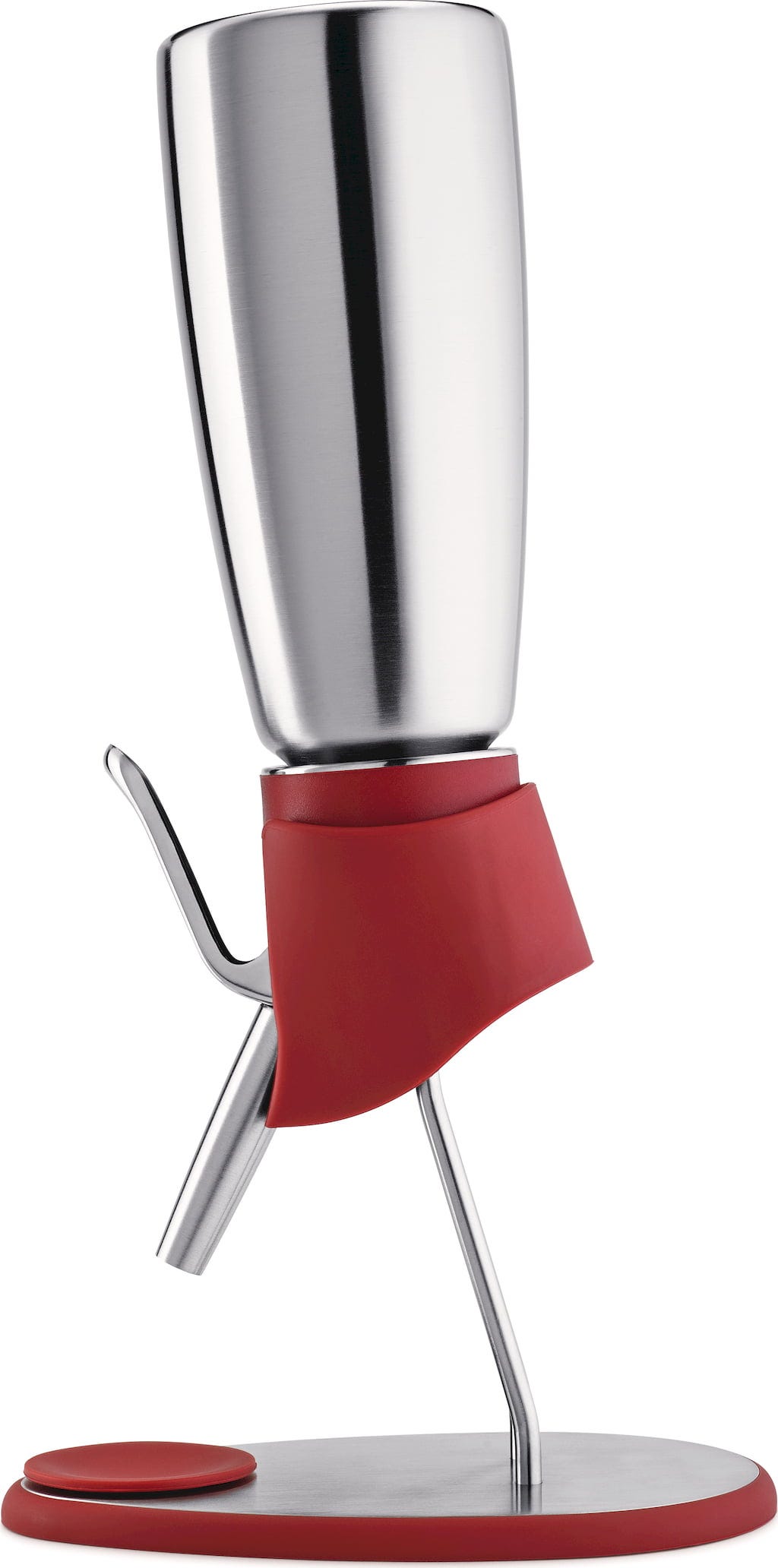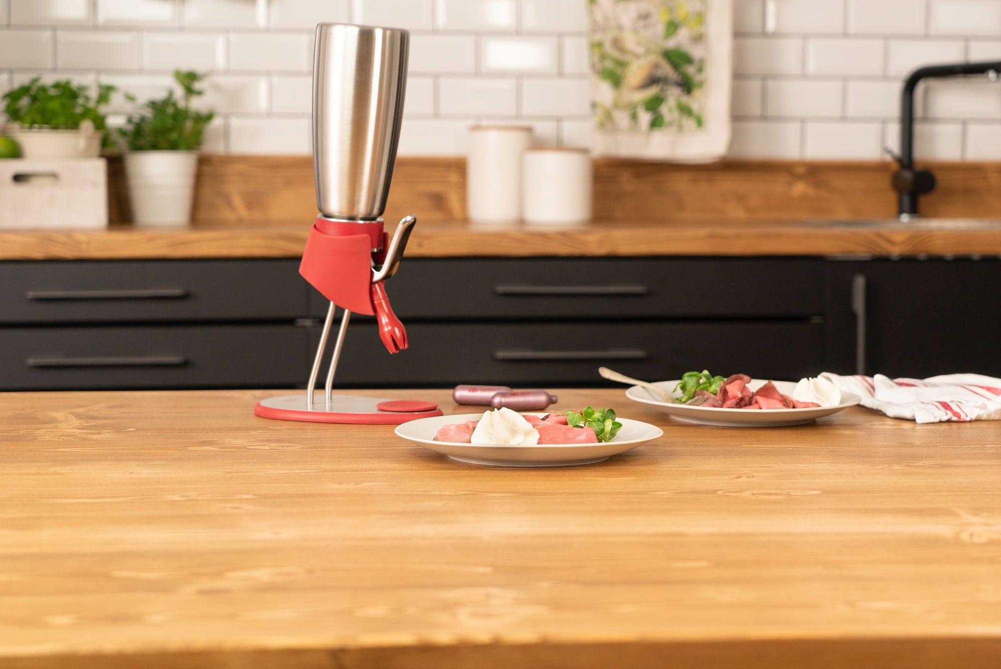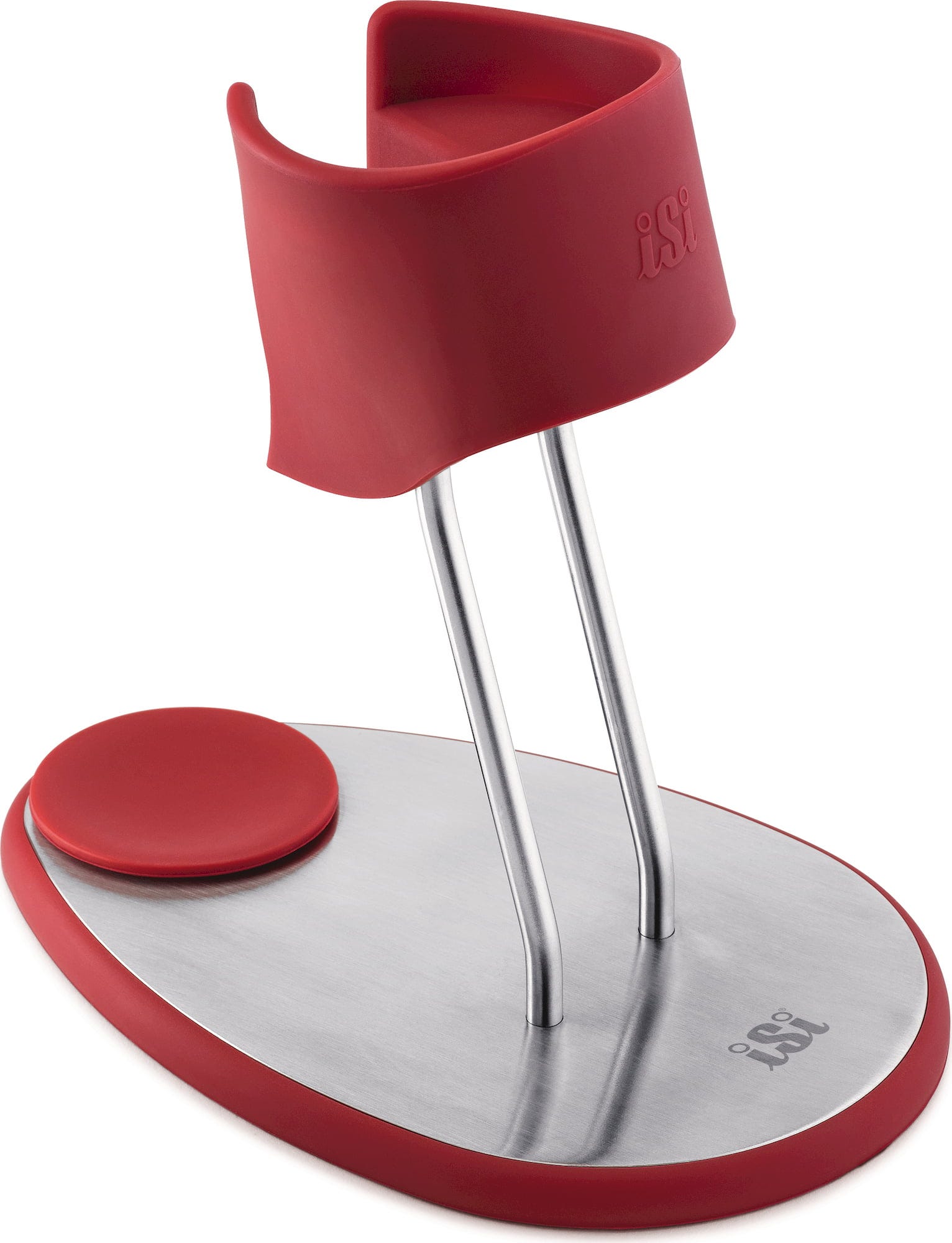 Dzięki stojakowi na butelki Twój iSi Whipper jest zawsze gotowy do użycia. Stojak zapewnia szybkie i łatwe zastosowanie, wstrząsanie przed zastosowaniem nie jest już konieczne. Wykonany z wysokiej jakości stali nierdzewnej i silikonu stojak zapewnia to, co obiecuje: wydajną pracę.
