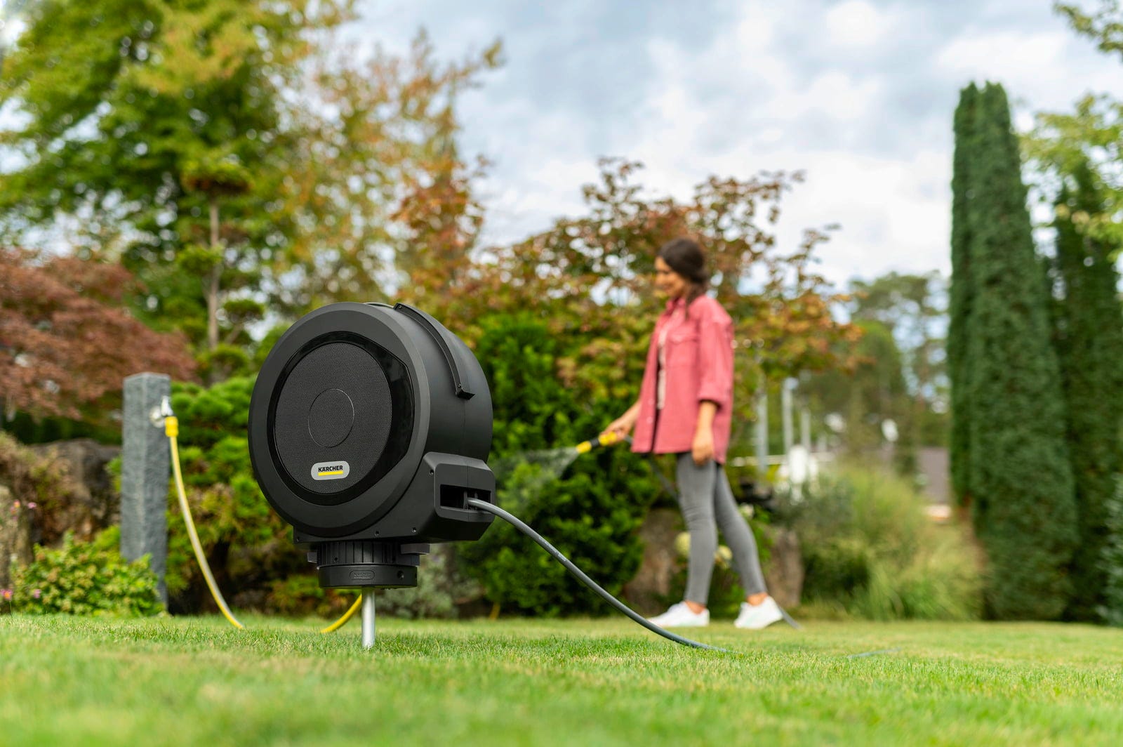 W połączeniu z bębnem na wąż marki Kärcher powstaje wyjątkowo elastyczny system węży w ogrodzie. Zamontowany bęben można obracać o 360°, co pozwala na swobodne prowadzenie węża podczas podlewania. Redukuje to zagięcia węża i ułatwia korzystanie ze zwijacza do węża do nawadniania ogrodu wokół rabat, trawników czy obszarów z roślinnością. Dzięki technologii FlexChange bęben na wąż można dodatkowo osadzić na szpicu lub zdjąć bez użycia narzędzi. W ten sposób zwijacz do węża ogrodowego można zastosować dokładnie tam, gdzie potrzebna jest woda.