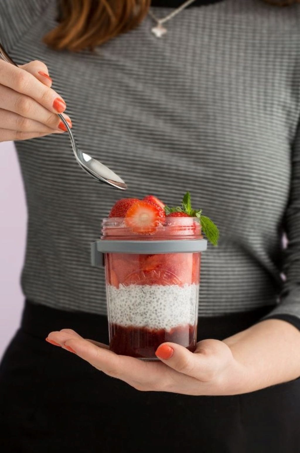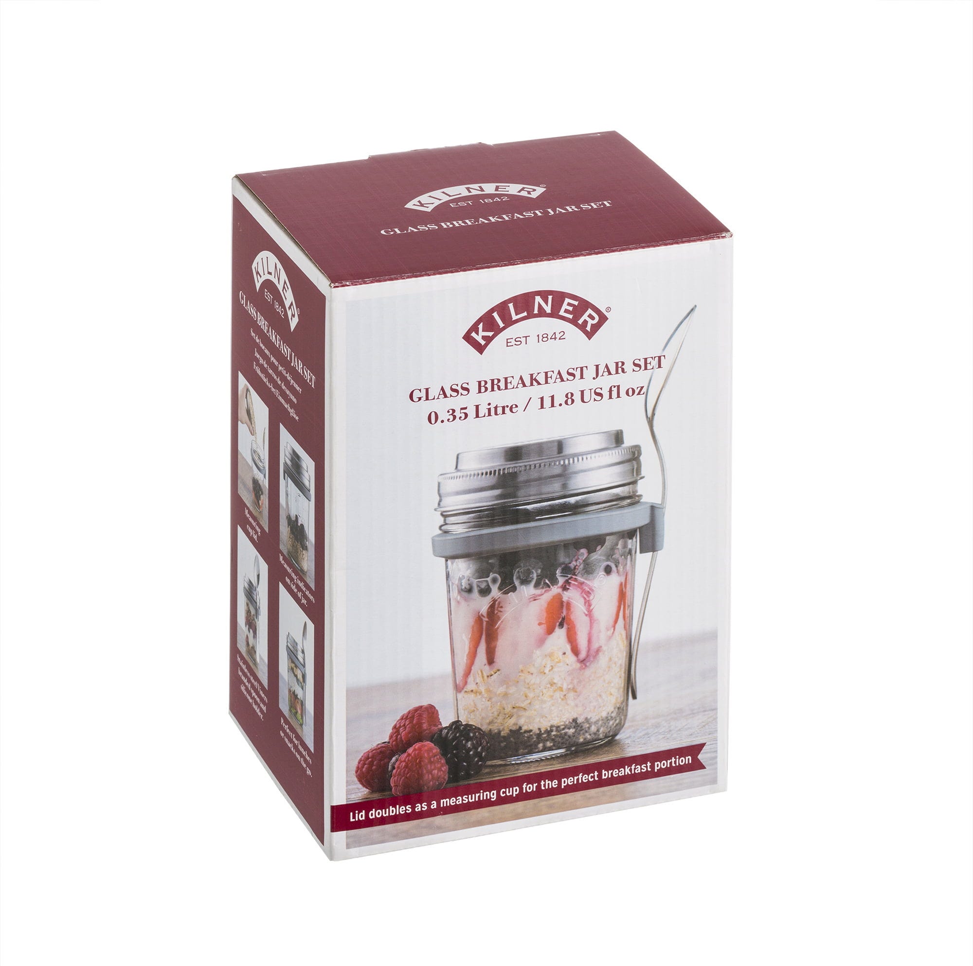 W zestawie znajduje się szklanka Kilner (0,35 litra) z unikalną pokrywą ze stali nierdzewnej, która nadaje się również jako miarka dla lepszej kontroli porcji. Praktyczny zestaw zawiera również łyżkę ze stali nierdzewnej, silikonowy uchwyt łyżki i hermetyczną podkładkę do pokrywki.