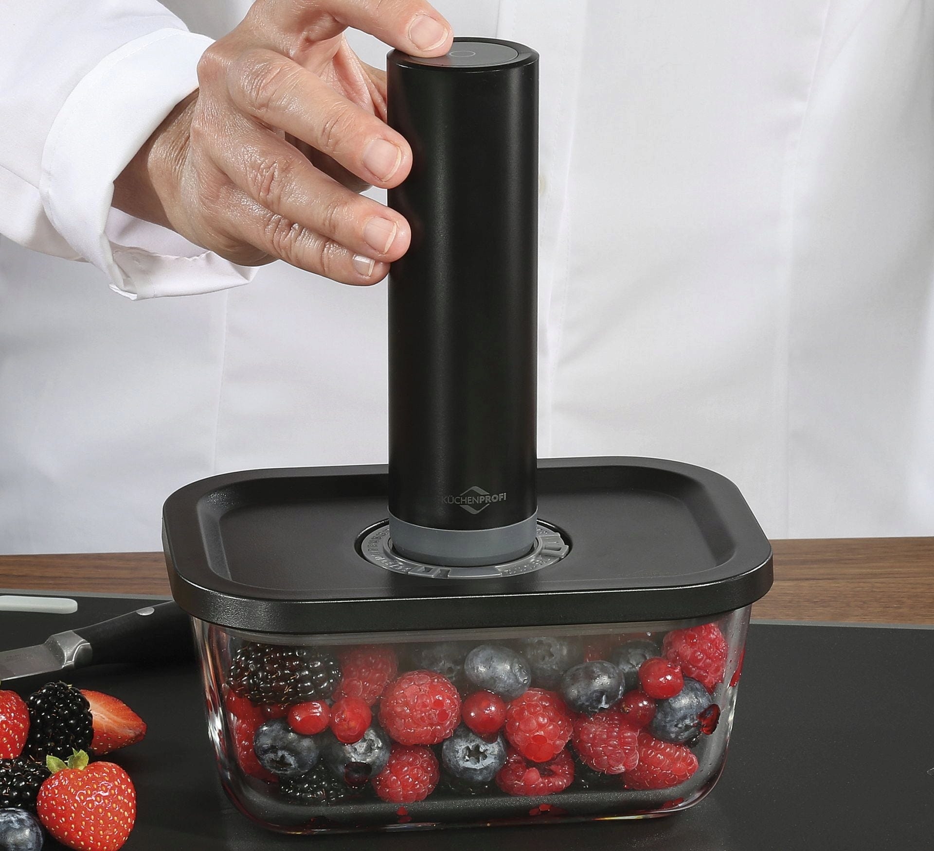 Zaczynamy: Przenieś żywność do szklanego pudełka lub worka próżniowego i usuń powietrze za naciśnięciem jednego przycisku za pomocą elektrycznej pompki próżniowej. Pozwala to zachować aromat, smak i składniki odżywcze żywności. Następnie przechowywać w lodówce lub zamrażarce. Szczególnie praktyczne: szklane pojemniki można następnie wykorzystać bezpośrednio do odgrzewania.