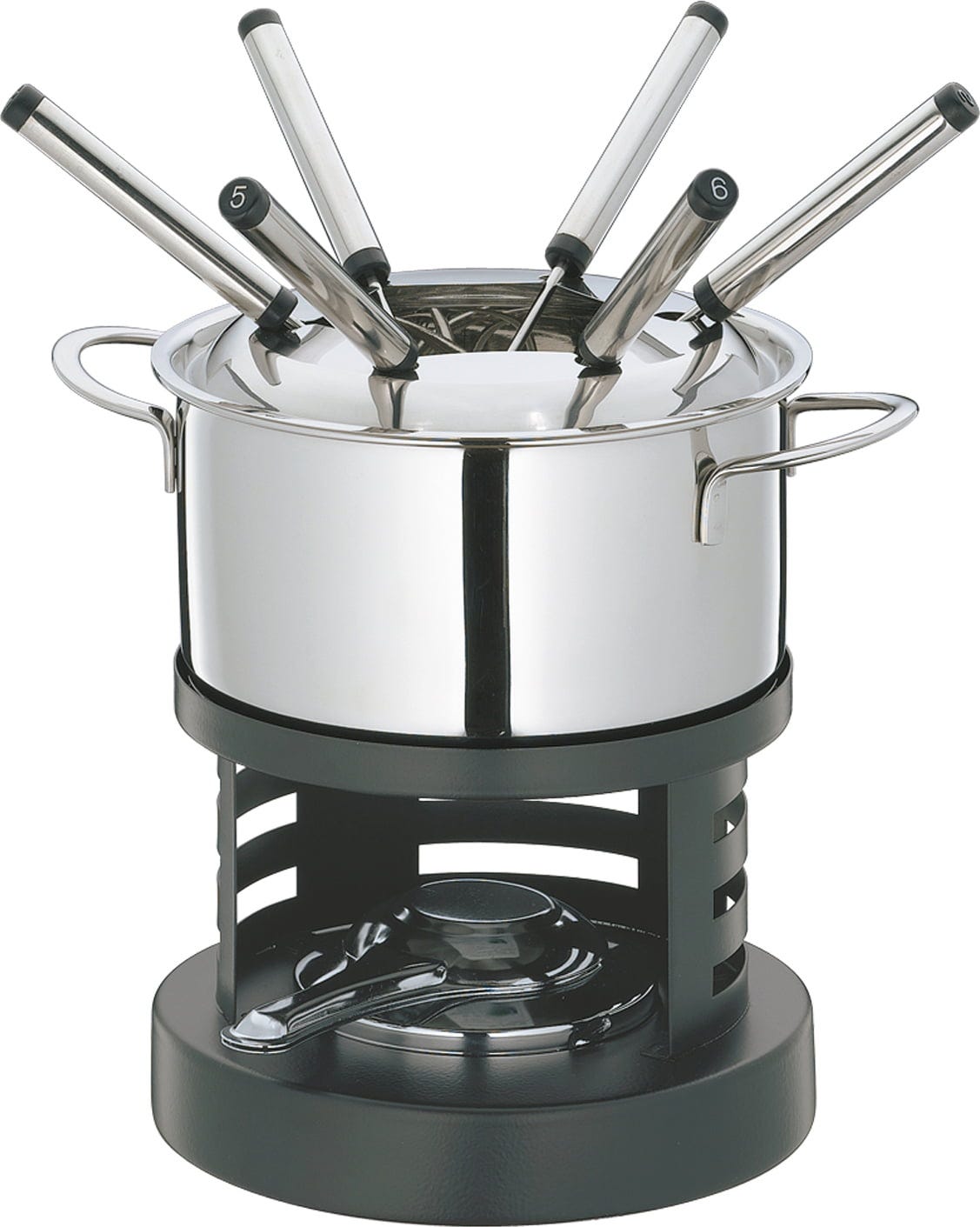 Zakres dostawy: Garnek do fondue z osłoną przeciwbryzgową, rechaud, bezpieczny palnik do pasty, 6 widelczyków do fondue