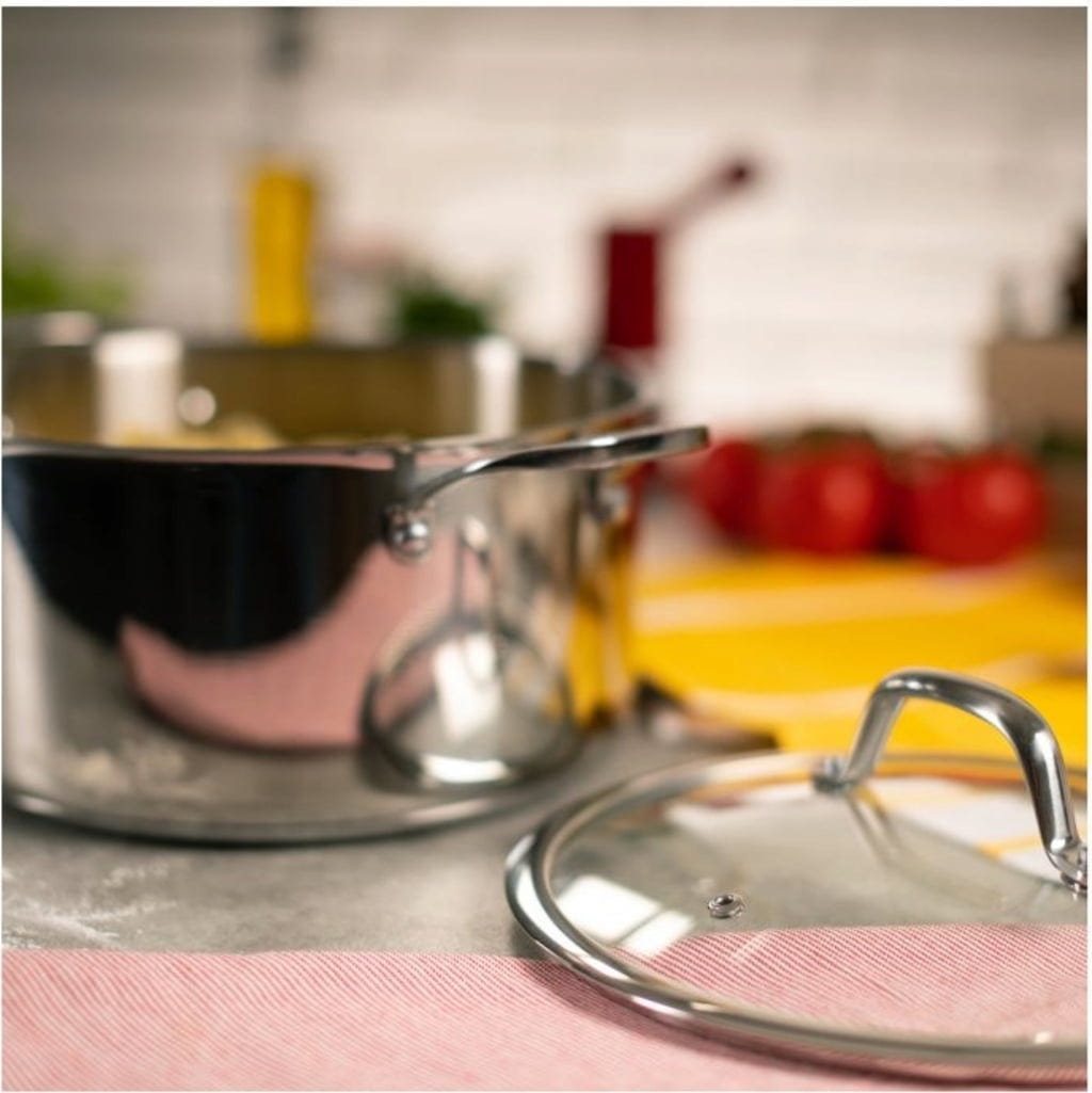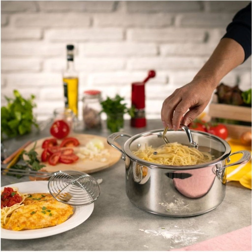 Wykonany jest z wysokiej jakości stali nierdzewnej i ma grubą podstawę, która zapewnia optymalną dystrybucję i magazynowanie ciepła, dzięki czemu podczas gotowania nie marnuje się energia. Praktyczne uchwyty po bokach nie nagrzewają się nawet w wysokich temperaturach, a dzięki szklanej pokrywie ze zintegrowanym odpowietrznikiem pary można mieć wszystko na oku podczas gotowania.