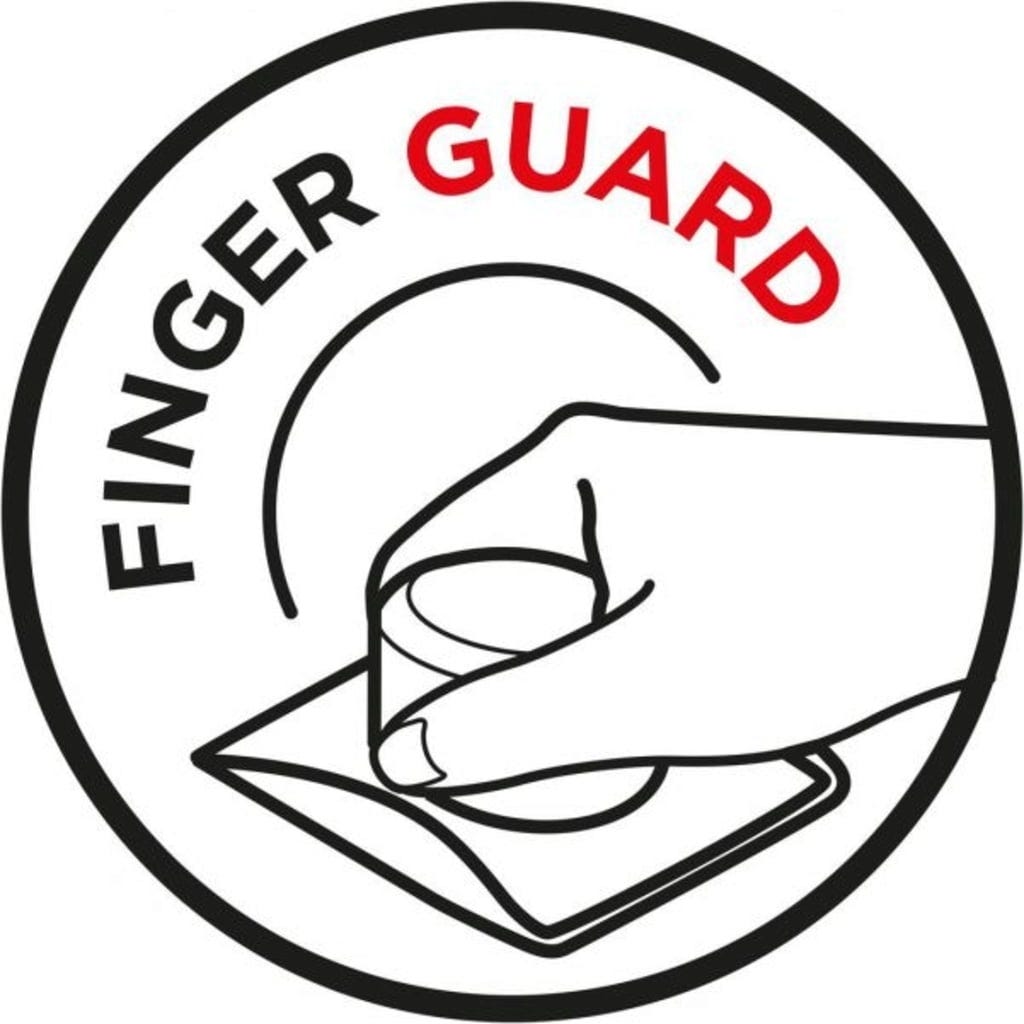 Ostrza zatrzaskują się w górnej części zbiornika, umożliwiając czystą i łatwą obsługę. Antypoślizgowe dno i wygodny uchwyt gwarantują bezpieczną pracę i stabilność. Chroń swoje palce za pomocą osłony na dłonie.