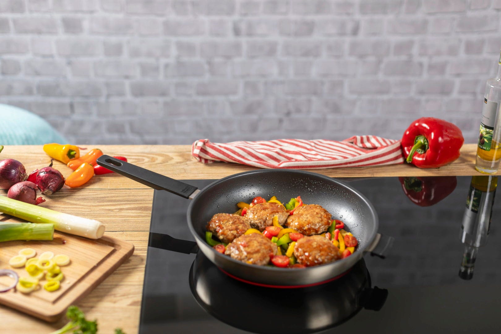 - Idealna do równomiernego, delikatnego i niskotłuszczowego smażenia warzyw, filetów rybnych, mięsa i ziemniaków