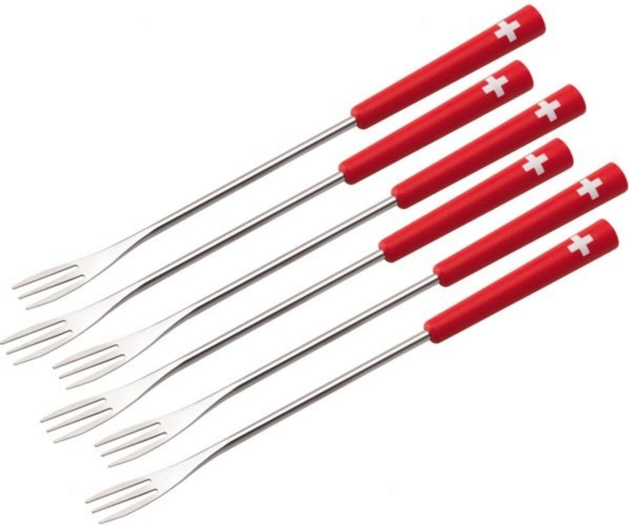 Te 6 klasycznych widelców do serowego fondue jest wyposażonych w czerwony plastikowy uchwyt z białym szwajcarskim krzyżem.