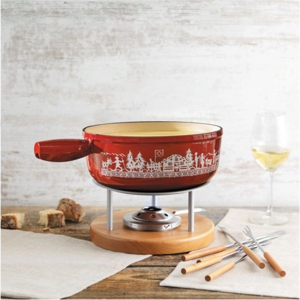 Klasycznego szwajcarskiego szyku nie powinno zabraknąć podczas wieczoru z fondue. Żeliwny kociołek z czerwonym szkliwem i białym nadrukiem sylwetki tworzy idealną atmosferę. Zachwyca również idealną pojemnością cieplną i utrzymywaniem ciepła. Prawdziwy hit.