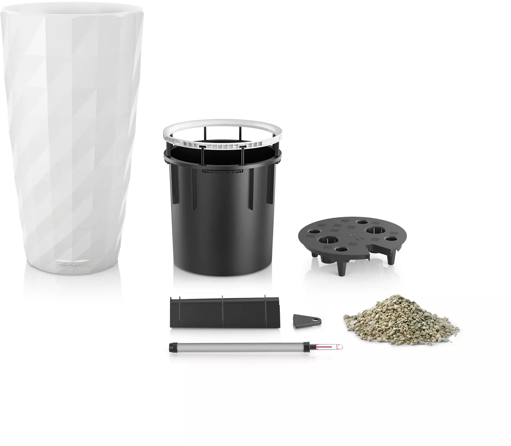 Zakres dostawy: doniczka + wkładka na rośliny z wysuwanymi uchwytami do przenoszenia (opatentowane), zestaw do podlewania Lechuza