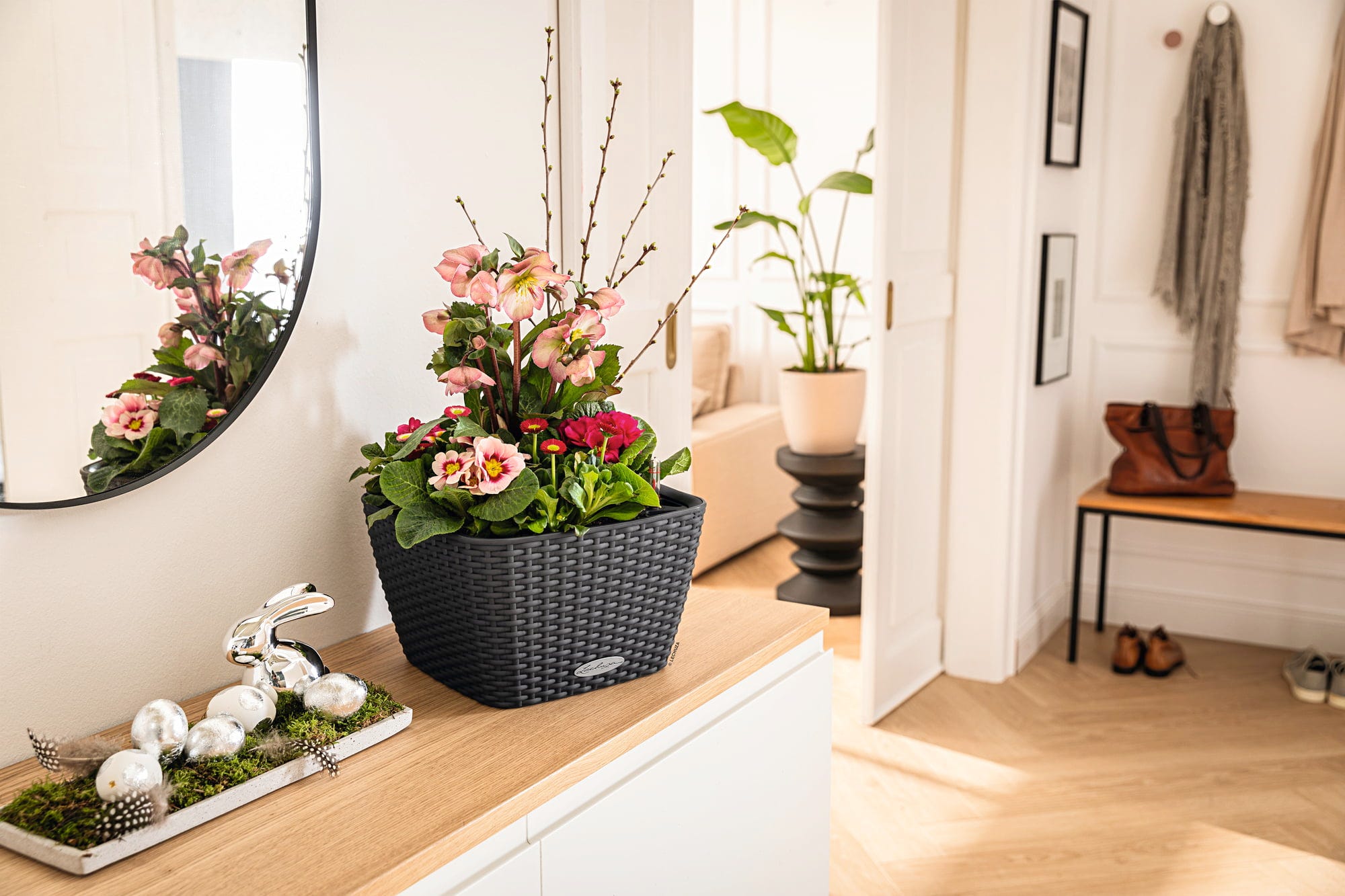 Donica BACINO z kolekcji Cottage o kwadratowej powierzchni i idealnej wysokości 18 cm to prawdziwie wszechstronny gadżet na balkonie i tarasie. Niezależnie od tego, czy stoi przy stole, na podłodze czy na podeście: pięknie obsadzona, wszędzie czuje się jak u siebie, a nawet w domu prezentuje się znakomicie. Dzięki opatentowanemu systemowi nawadniania Lechuza, w każdej chwili zapewniona jest optymalna ilość wody