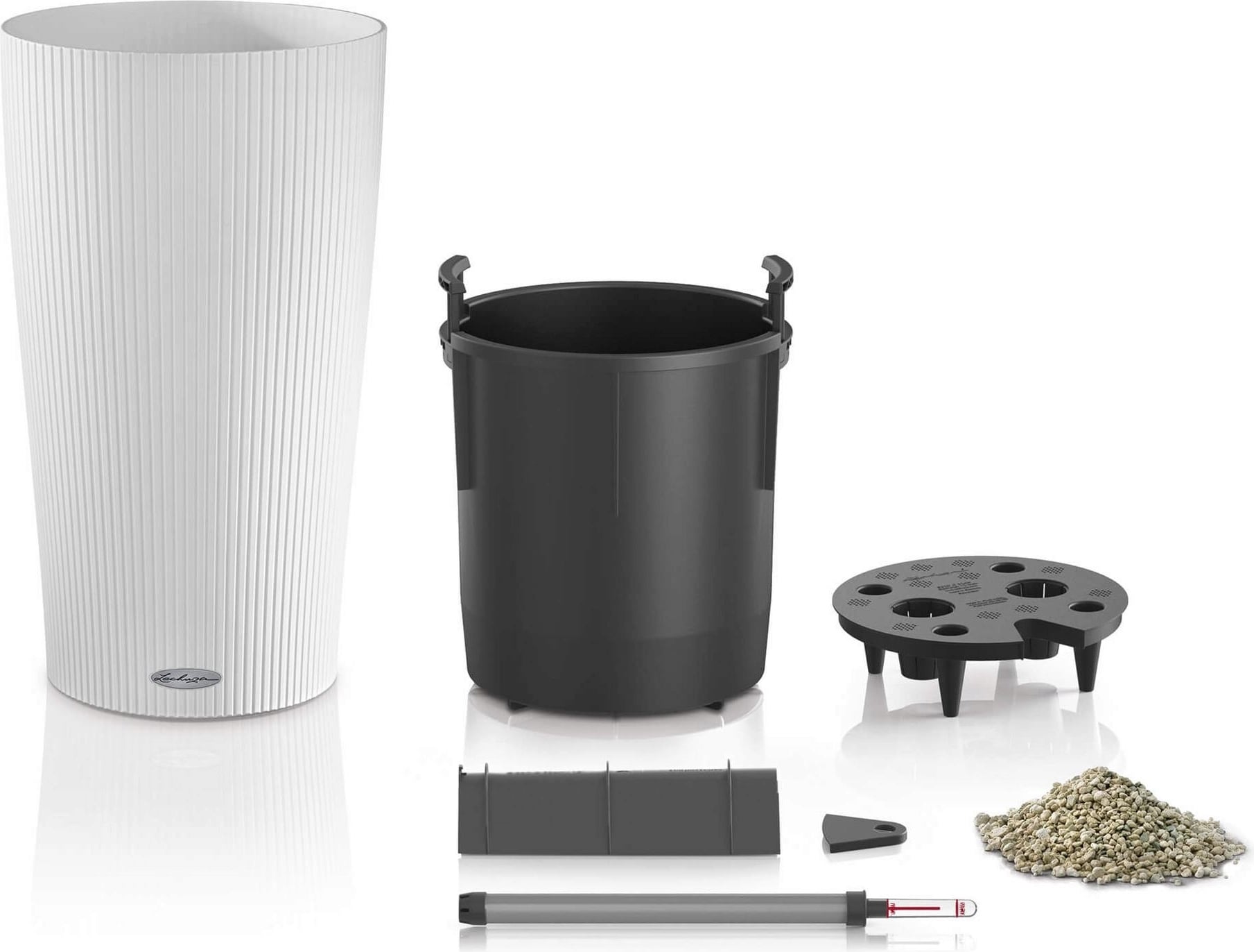 Cilindro to zestaw typu „All-in-One” zawierający doniczkę, wkładkę do roślin, wskaźnik poziomu wody i podłoże dla roślin.