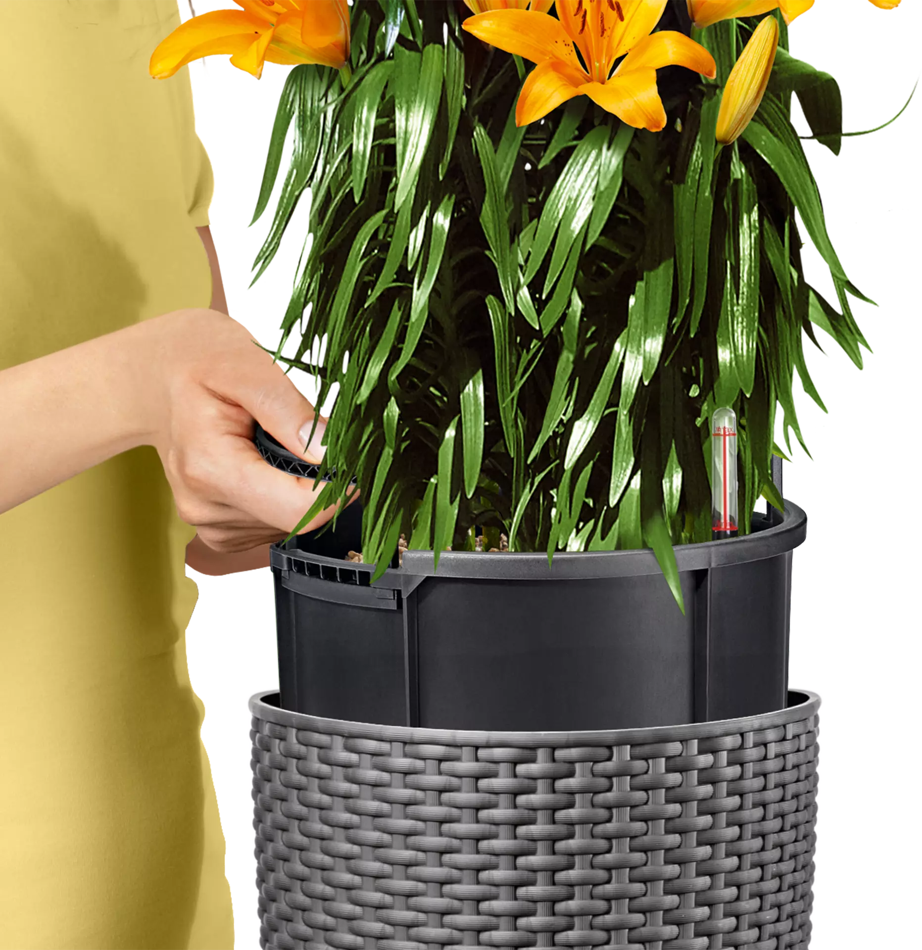 Wąska kolumna do sadzenia roślin Cilindro jest idealna do projektowania indywidualnych koncepcji pomieszczeń w domu, w biurze lub w pomieszczeniach biznesowych. Prosta elegancja i atrakcyjna wiklinowa struktura skutecznie wyeksponują rośliny. Ale doniczka jest nie tylko atrakcyjna wizualnie: dzięki opatentowanemu systemowi nawadniania rośliny są samowystarczalne dzięki zbiornikowi na wodę. Dzięki praktycznej funkcji przelewania woda nie zalega w donicy, nawet gdy jest ona używana na zewnątrz.