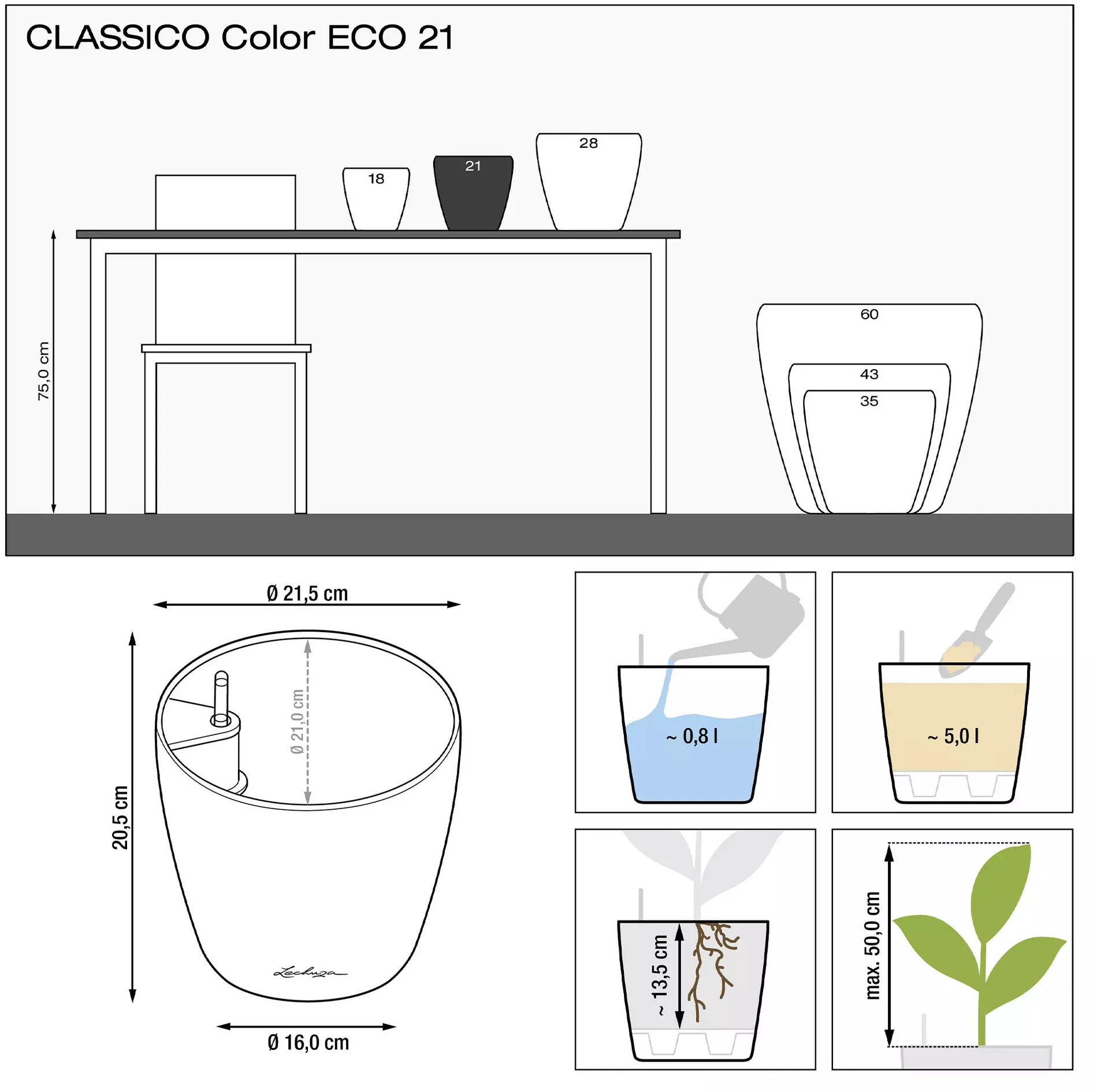 Doniczka Classico Color 28 marki Lechuza pięknie wyeksponuje Twoje rośliny zarówno wewnątrz, jak i na zewnątrz. Ponadczasowy design doskonale wpasuje się w każde wnętrze - zarówno w salonie i jadalni, jak i na tarasie lub balkonie.