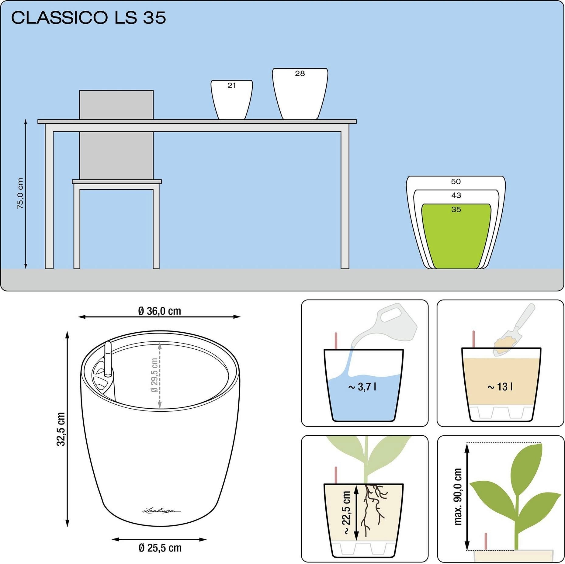 Wysokiej jakości donica CLASSICO Premium 35 LS marki Lechuza jest wykonana z nietłukącego się, odpornego na promieniowanie UV polipropylenu. Dzięki ponadczasowemu kształtowi donica nadaje się do każdej przestrzeni mieszkalnej. Opatentowany system wkładek ułatwia wymianę roślin.