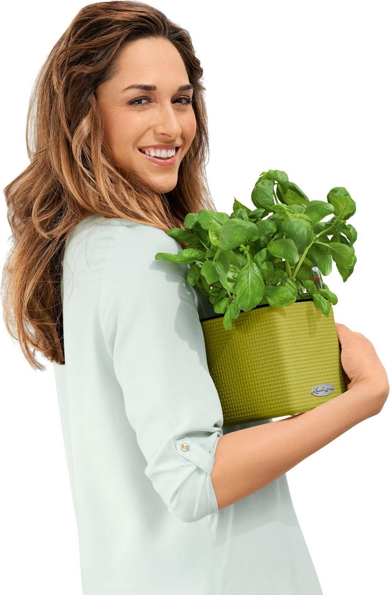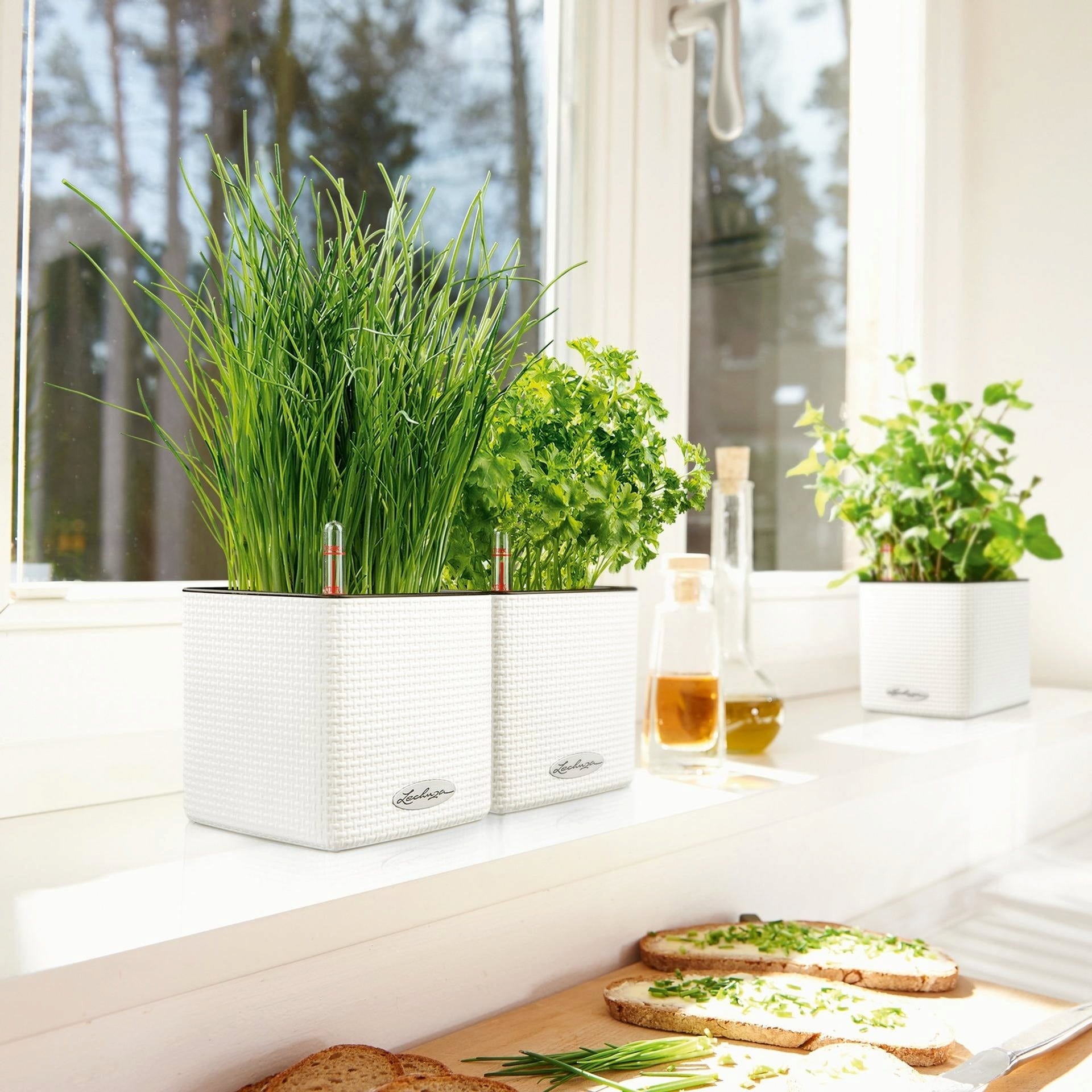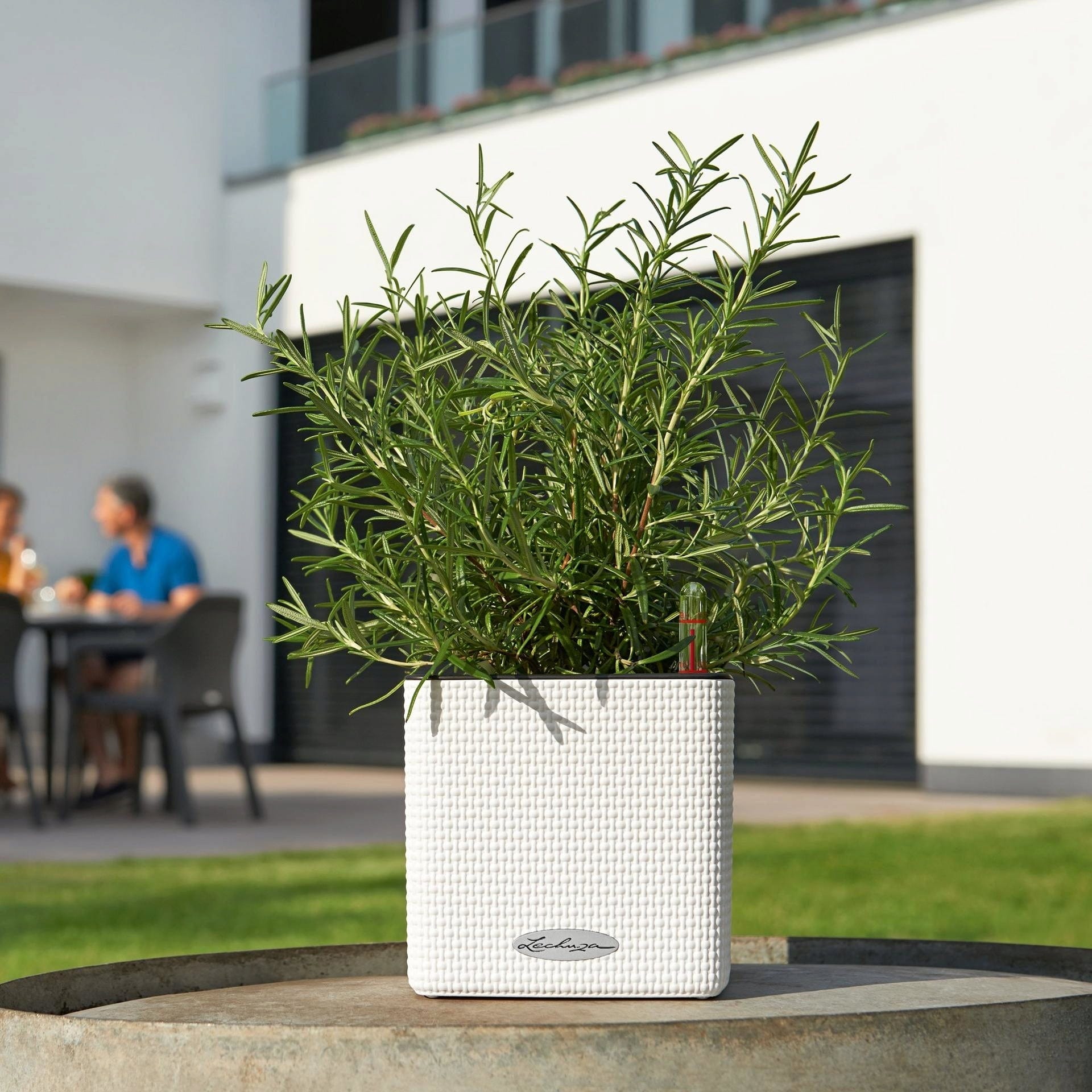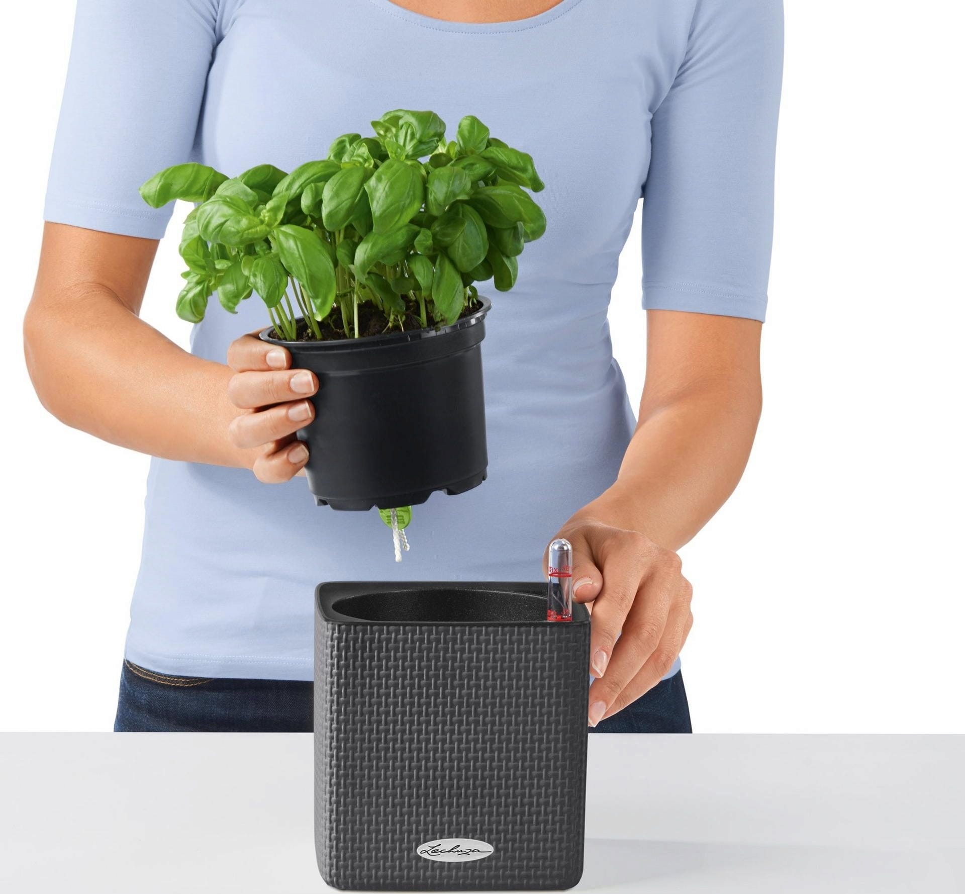 Urocza, mała doniczka na zioła Cube Color 14 marki Lechuza posiada knotowy system nawadniania. Bazylię, szczypiorek czy rozmaryn umieszcza się w niej wraz z doniczką produkcyjną, dzięki czemu przesadzanie nie jest już konieczne. Wystarczy wsunąć dołączony knot w dno doniczki produkcyjnej z ziołami i podlewać jak zwykle. Roślina sama pobierze odpowiednią ilość wody.