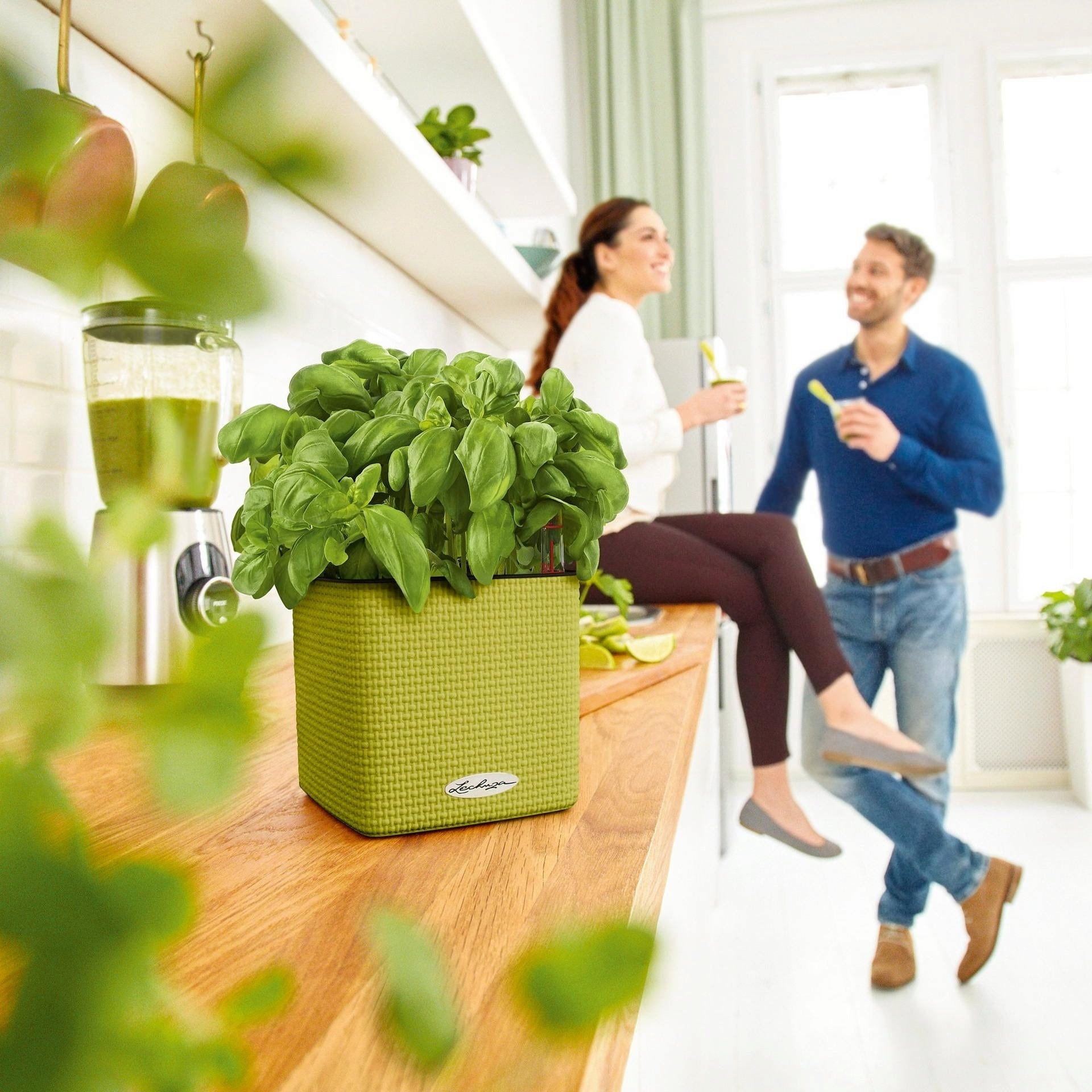 Ta atrakcyjna doniczka na zioła Cube Color 16 firmy Lechuza ma knotowy system nawadniania. Bazylia, szczypiorek, rozmaryn lub jednoroczne kwitnące rośliny ozdobne są umieszczane razem z doniczką, sadzenie nie jest już konieczne. Wystarczy włożyć dostarczony knot na dno doniczki i podlewać jak zwykle. Roślina otrzyma niezbędną ilość wody.
