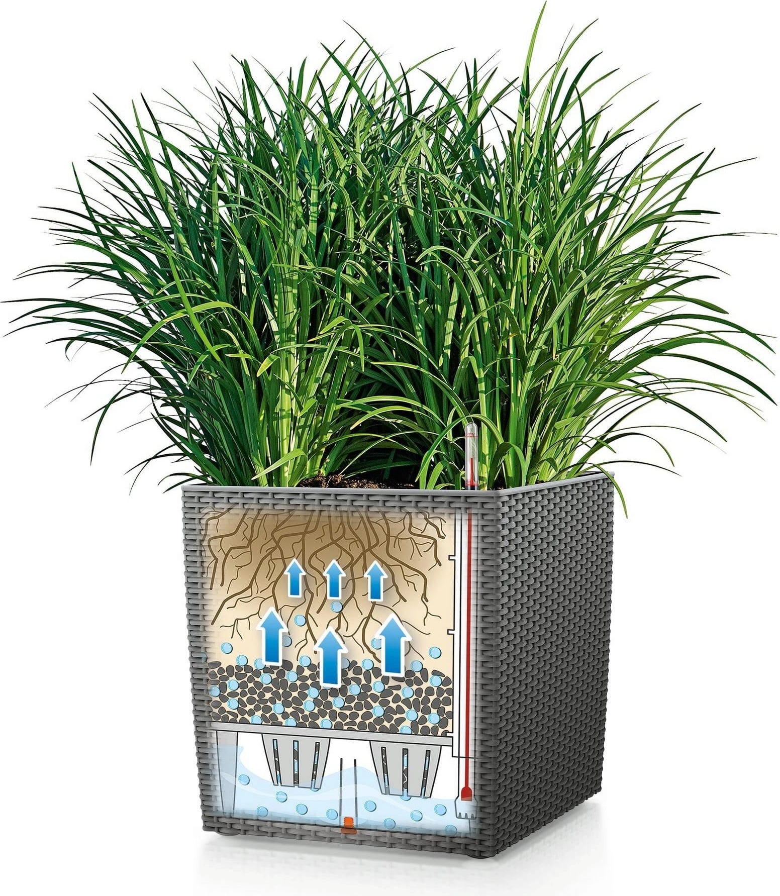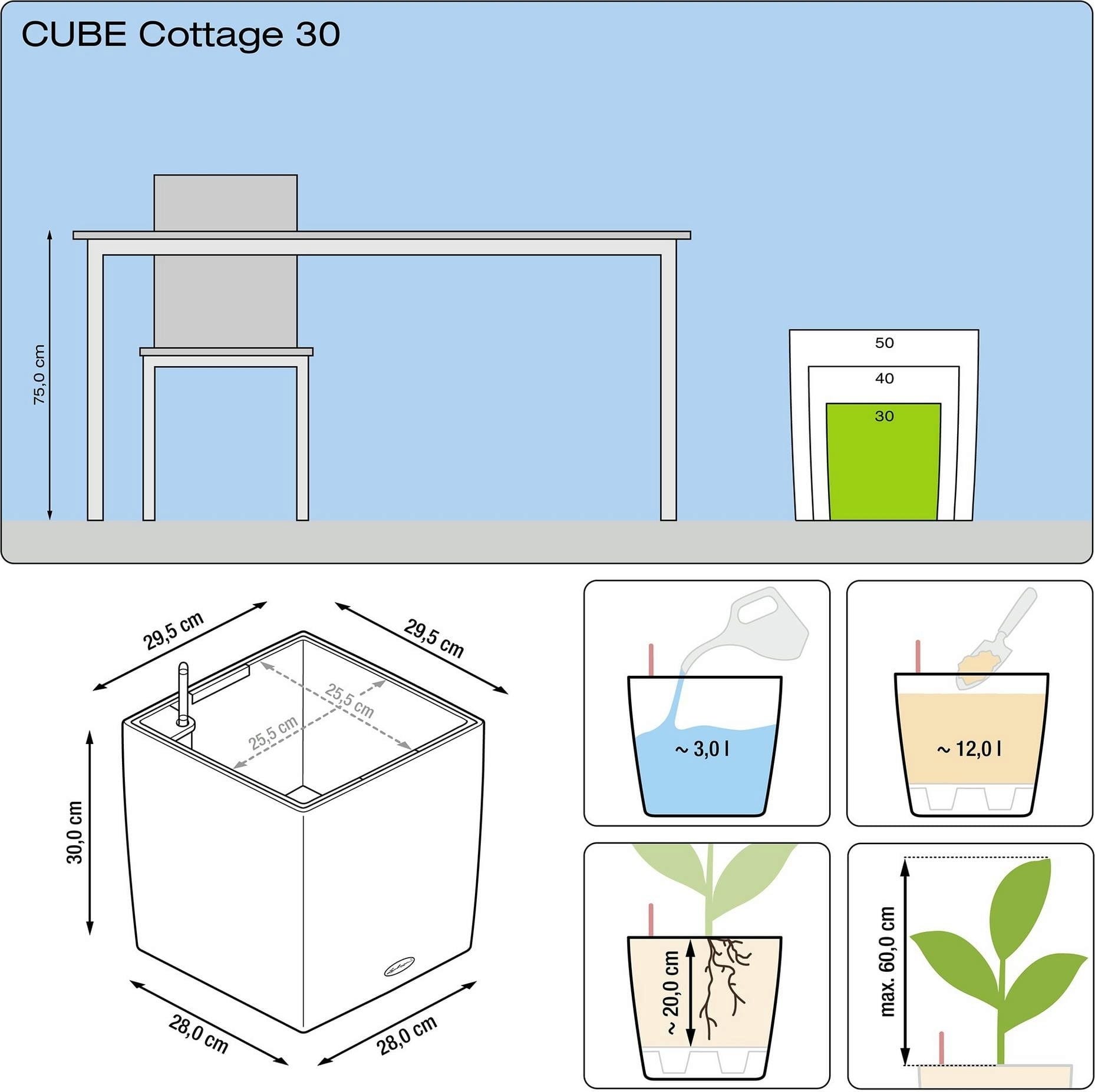 Donica CUBE Cottage 30 jest dostarczana wraz z wkładem do sadzenia oraz zestawem nawadniającym. Dzięki temu możesz z łatwością sadzić rośliny, a szybkie wkładanie i wyjmowanie nasadzeń oraz zimowanie staje się prostsze.