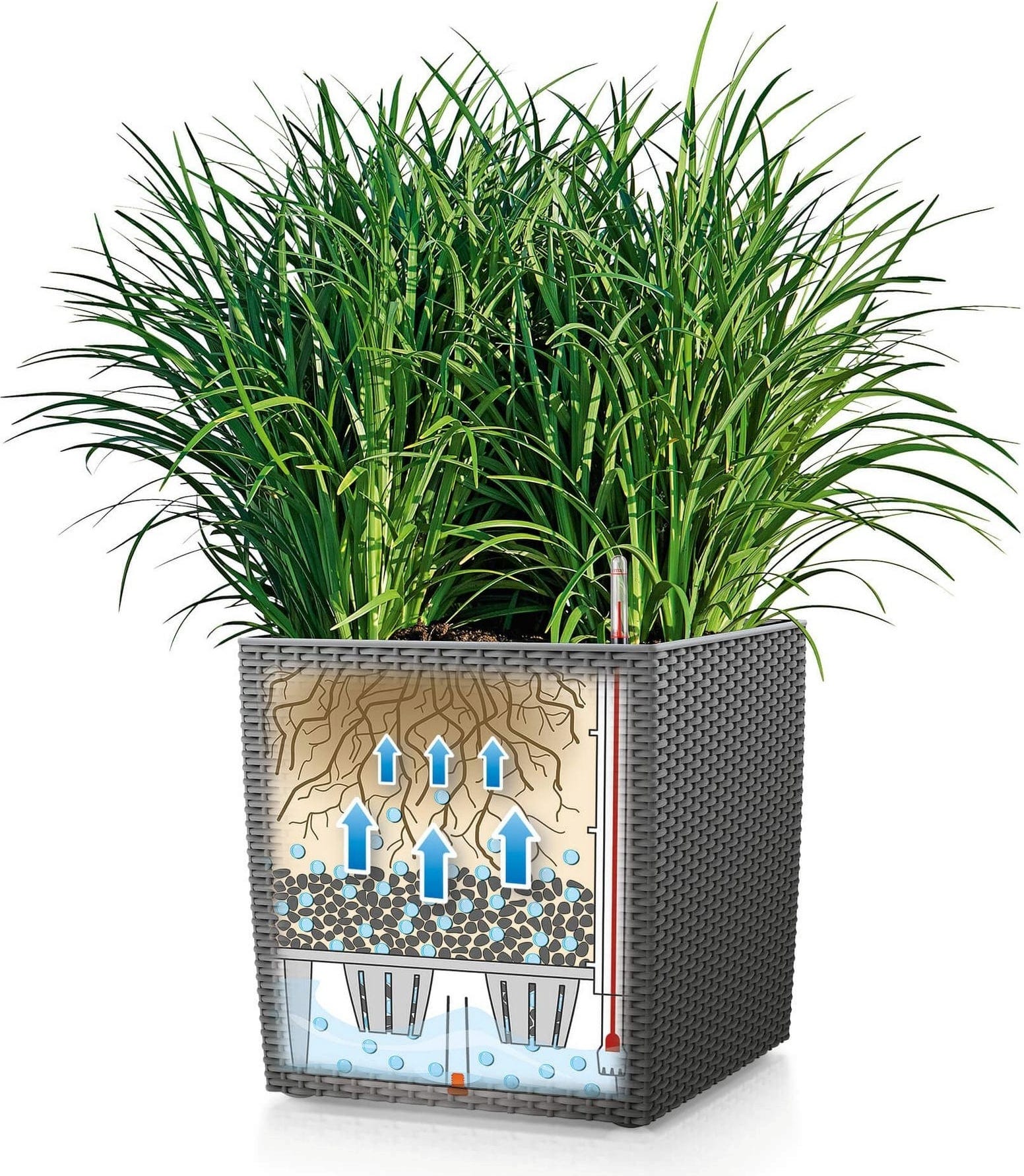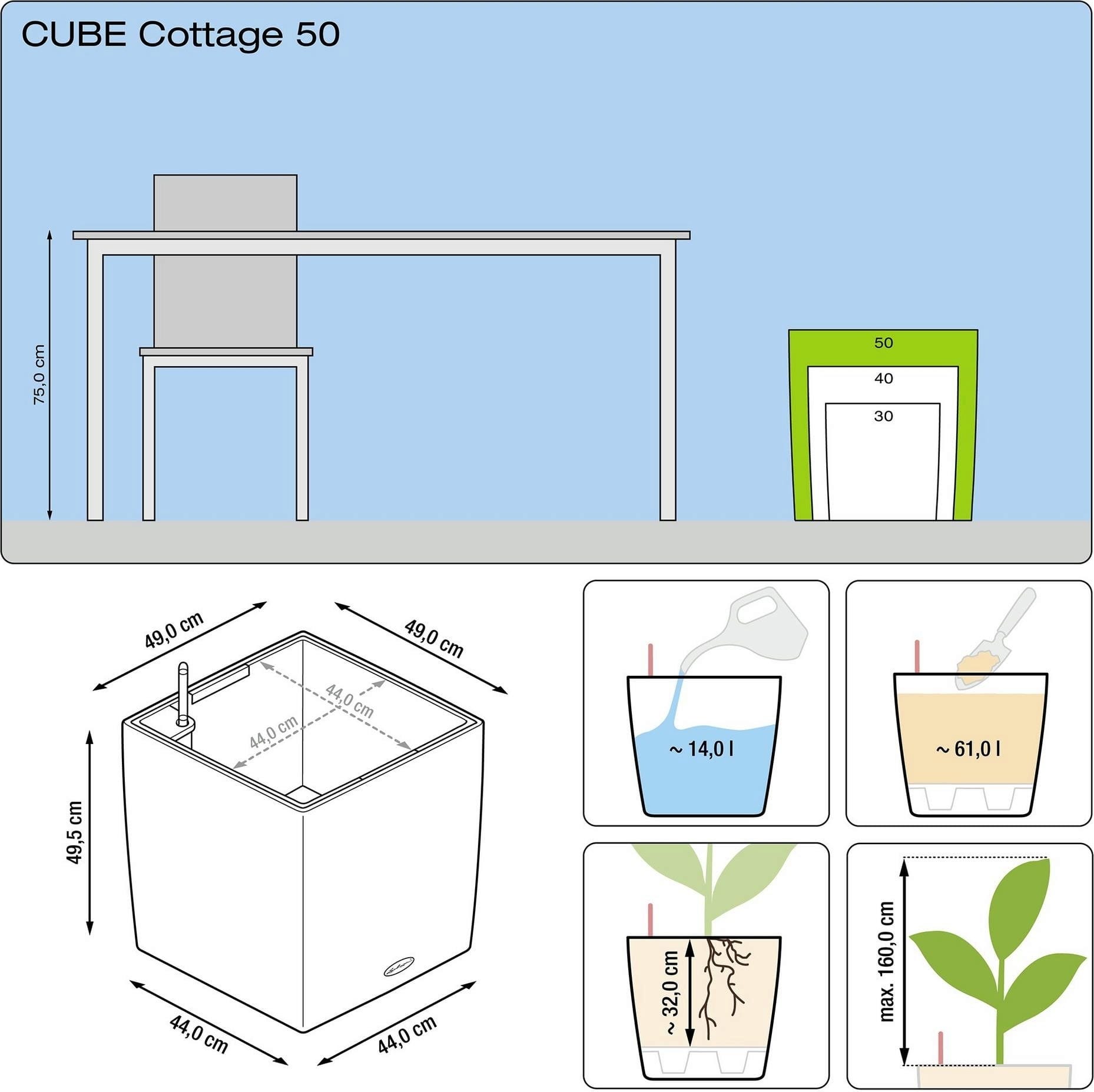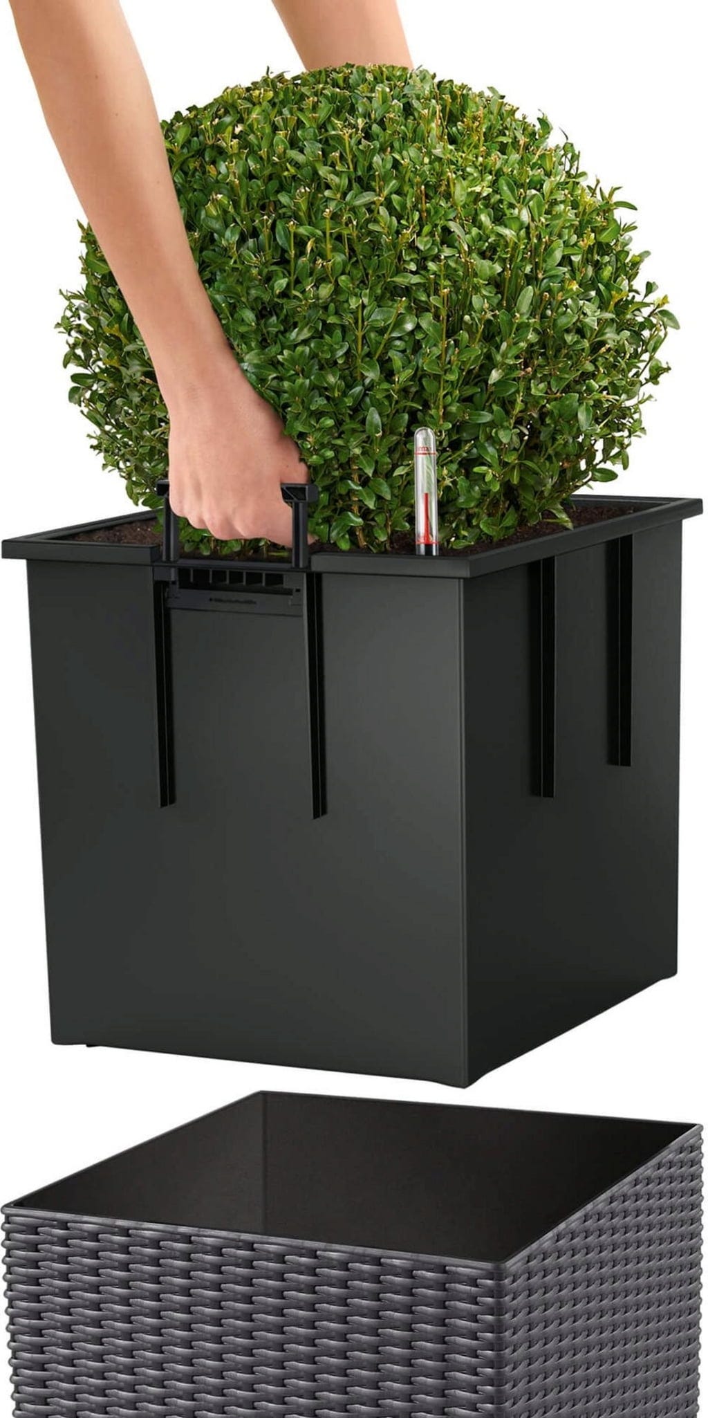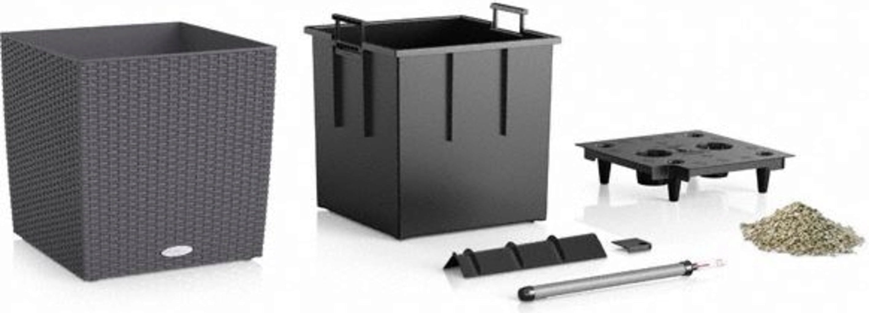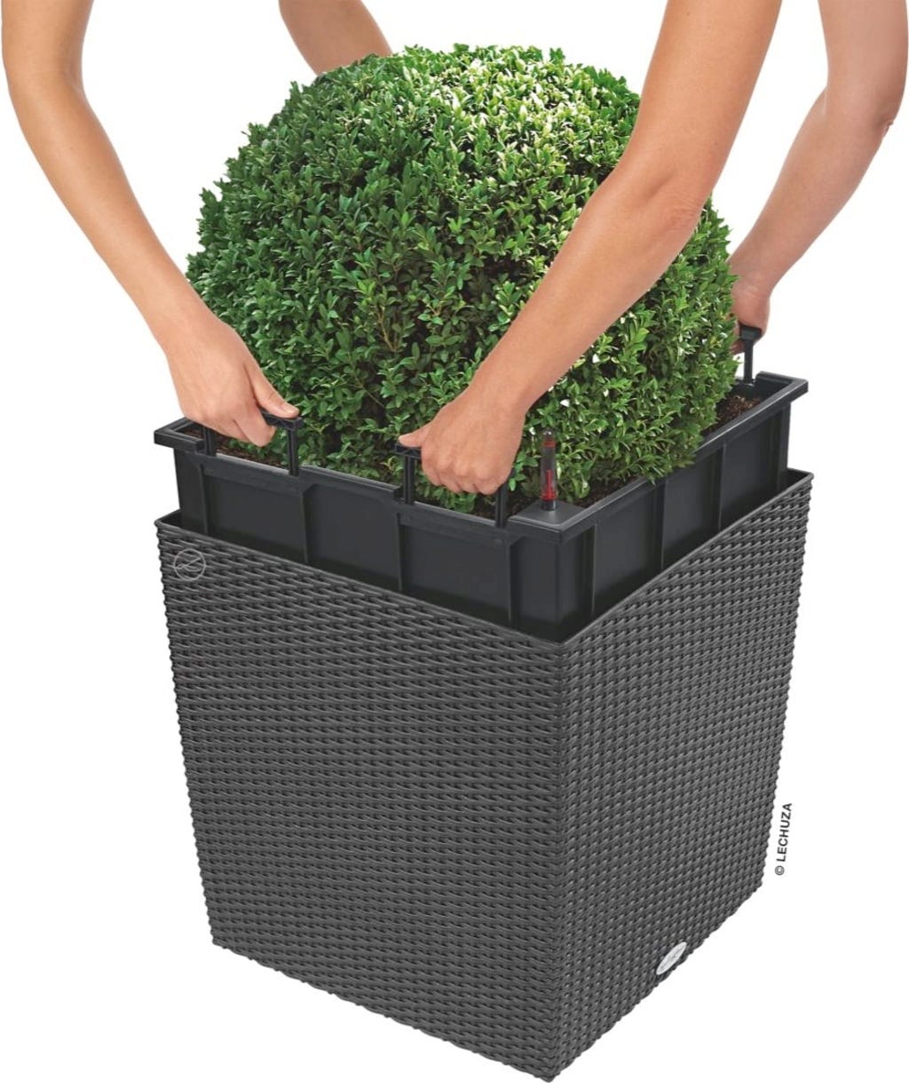 Doniczka CUBE Cottage 50 sprzedawana jest z wkładem i zestawem do podlewania. Dzięki temu sadzenie roślin w donicy jest łatwiejsze, a ich przesadzanie i wyjmowanie jest szybsze, a przechowywanie ich zimą łatwiejsze.
