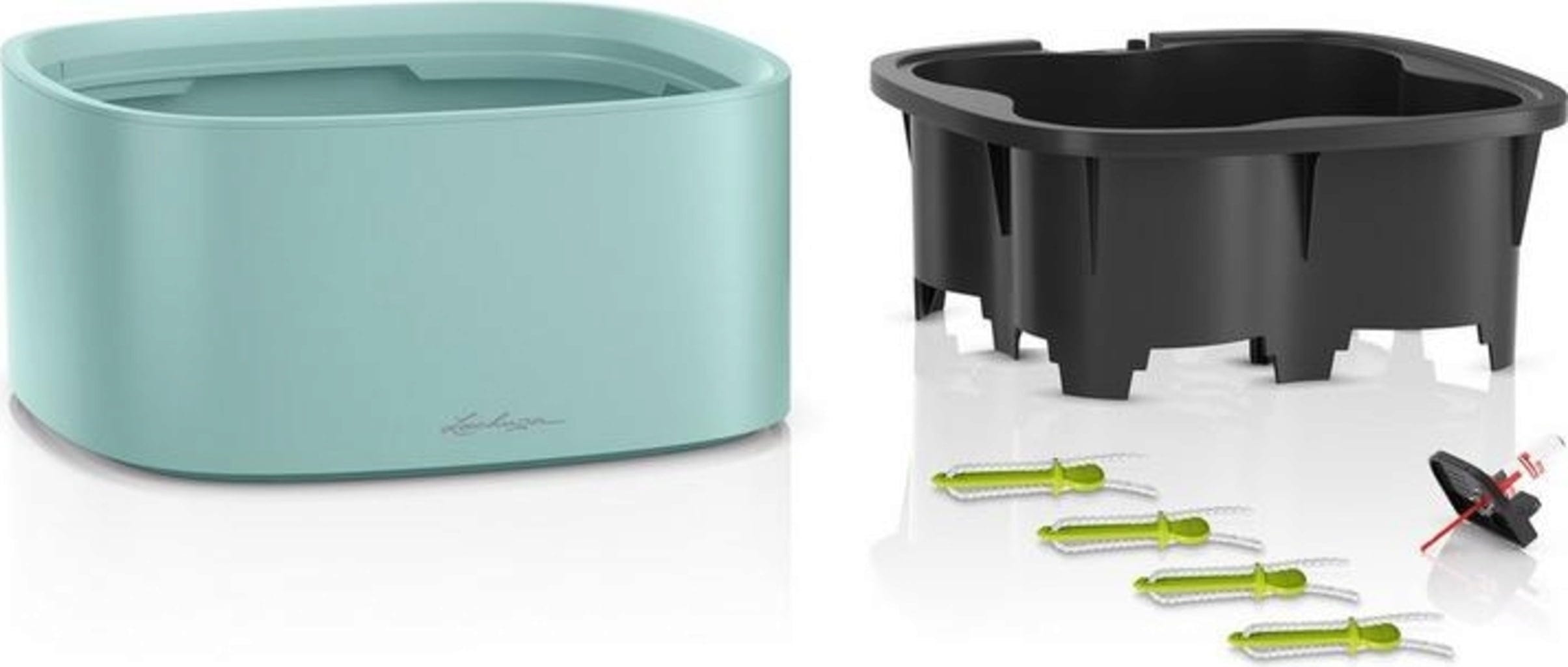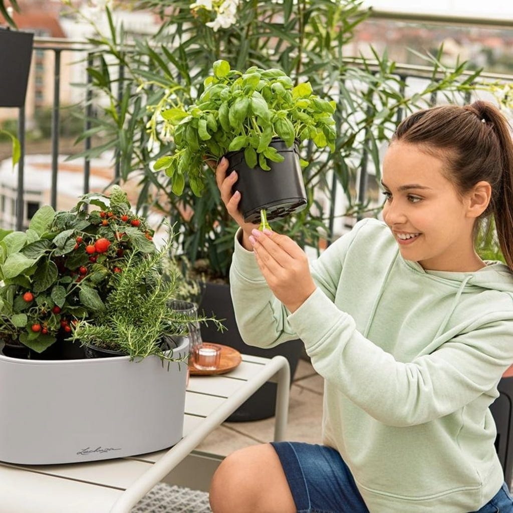 Wskazówka: Zakres dostawy obejmuje doniczkę oraz wkład do sadzenia z systemem nawadniania knotowego. Dodatkowe elementy do przechowywania, jak również praktyczna podstawka na kółkach, są dostępne osobno w sekcji "Akcesoria".
