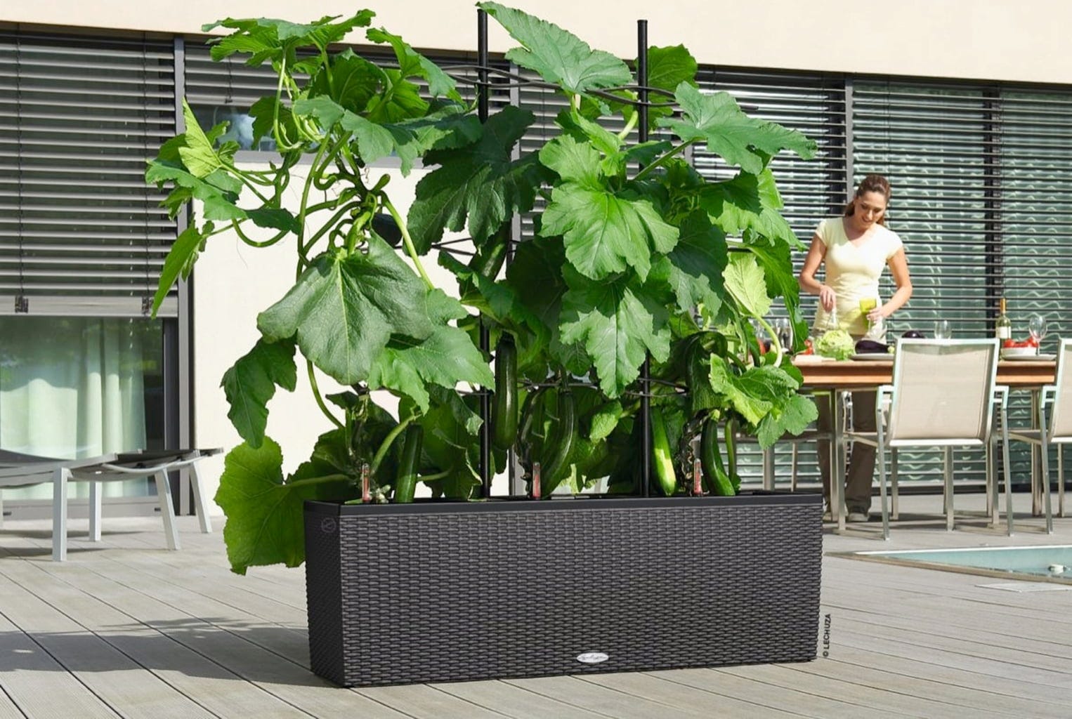 TRIO Cottage 40 marki Lechuza to osłona przed wzrokiem i grządka warzywna w jednym. Ta wszechstronna donica, dzięki wymiennym wkładom, idealnie sprawdza się jako element dzielący taras lub zielony parawan. Jest doskonała zarówno do własnej uprawy owoców i warzyw, jak i do nasadzeń z kwiatów lub roślin zielonych.