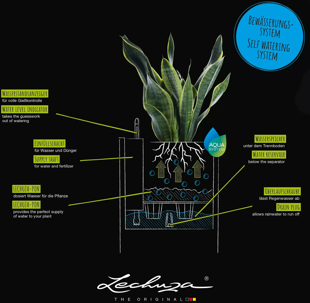 - Oryginalny system nawadniający LECHUZA do zaopatrzenia w wodę w zależności od zapotrzebowania.