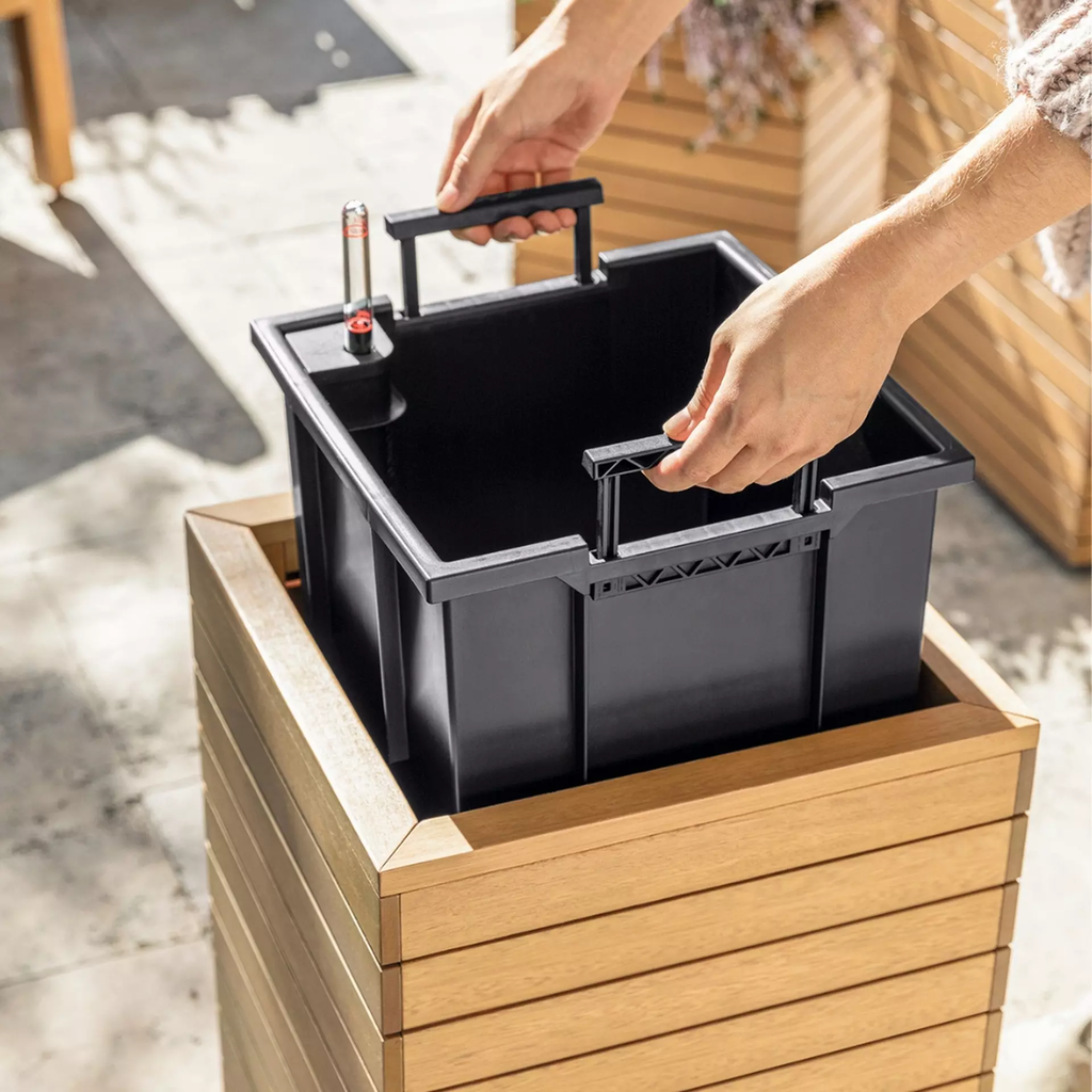 Wyjmowany wkład do roślin wykonany z przetworzonego plastiku ze składanymi uchwytami sprawia, że sadzenie i pielęgnacja roślin stają się dziecinnie proste. Jednocześnie sprawdzony system nawadniania LECHUZA gwarantuje optymalne zaopatrzenie roślin w wodę.