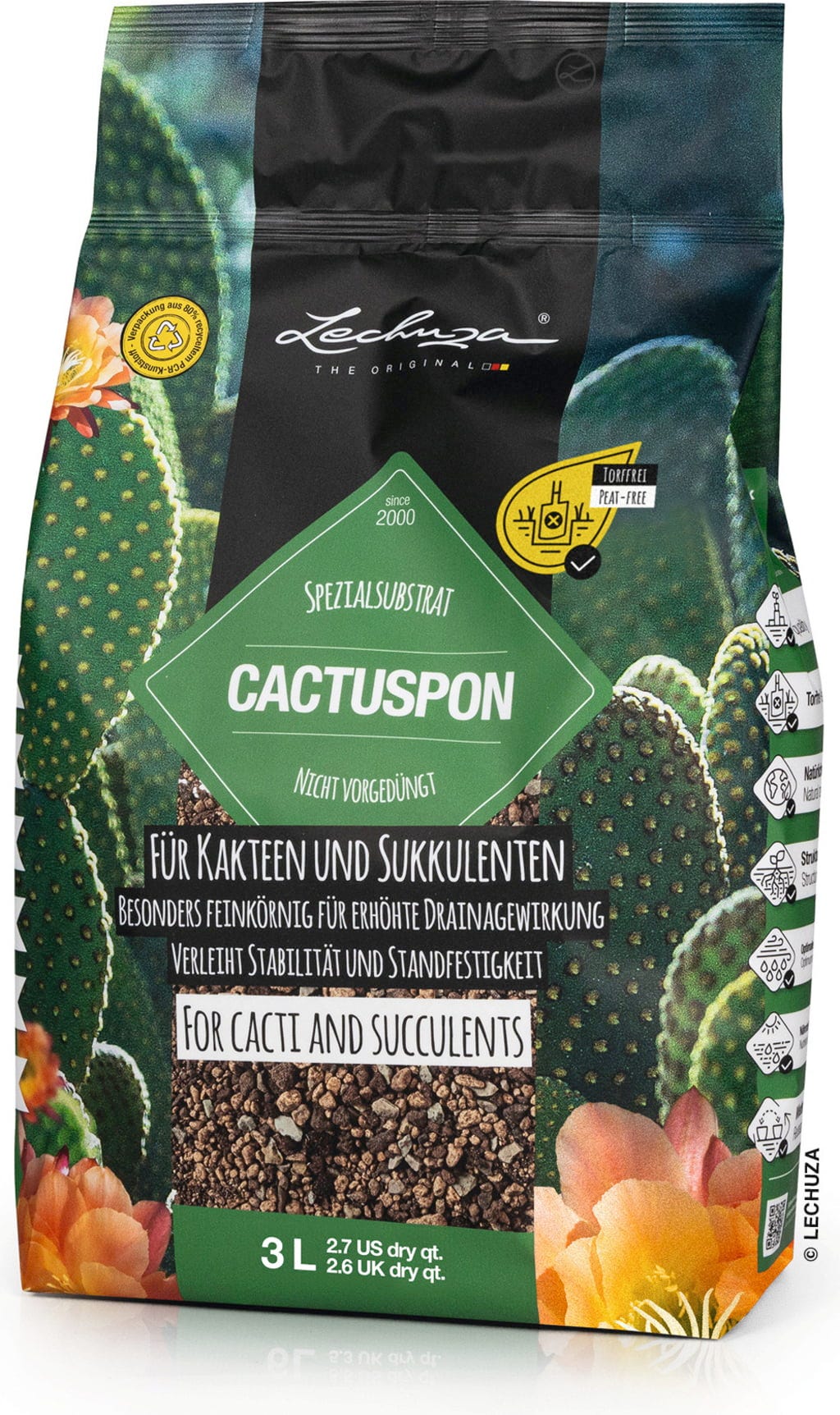 Czysto mineralne specjalne podłoże jest zoptymalizowane pod kątem potrzeb kaktusów i sukulentów.