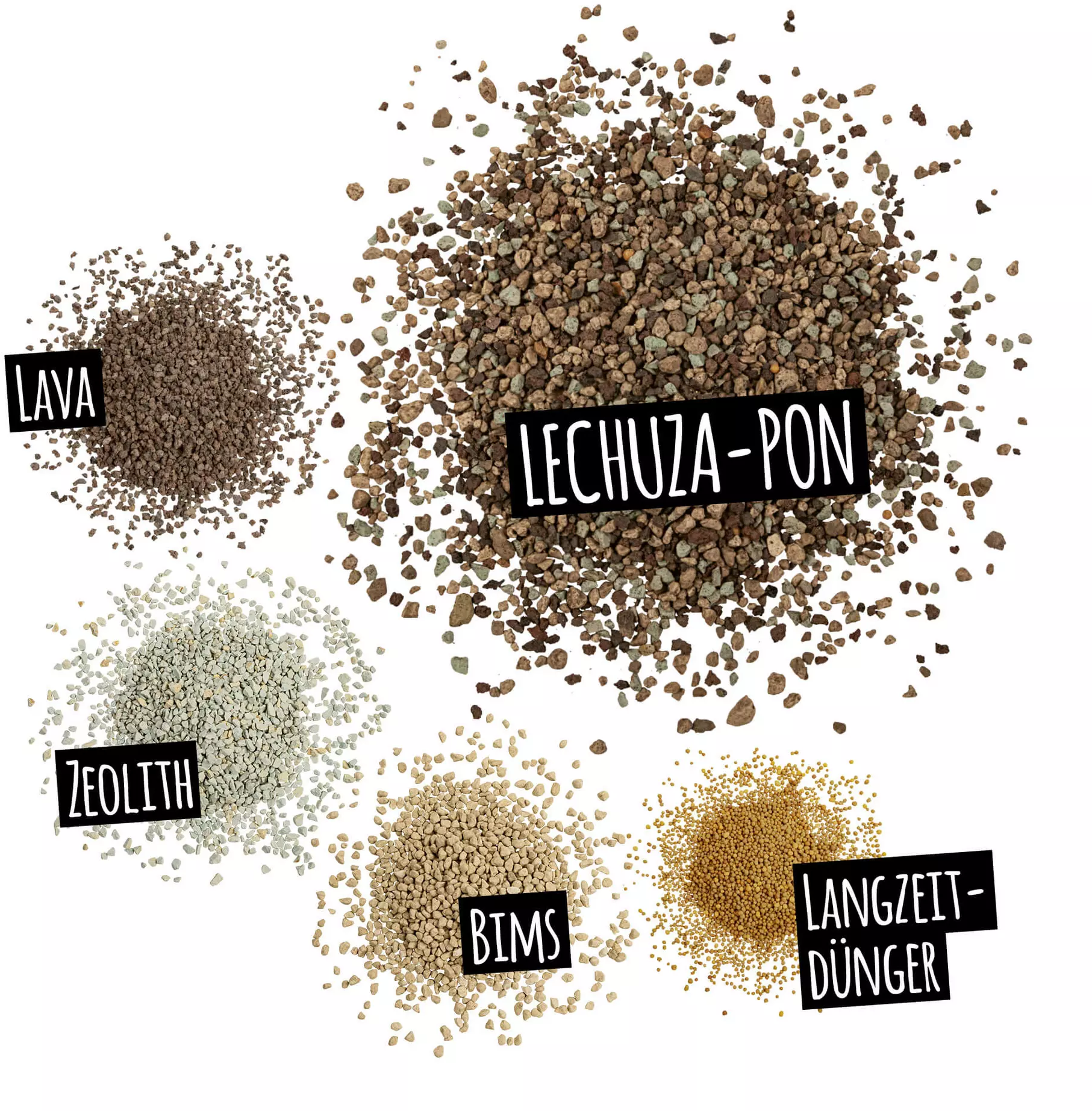 Dzięki doskonałej zdolności drenażu podłoże nie ma szans na zalanie wodą. Składa się z wysokiej jakości zeolitów, pumeksu i lekkiej lawy i pozostaje stabilne strukturalnie, ponieważ w przeciwieństwie do gleby, podłoże nie może się zbijać ani zbrylać.