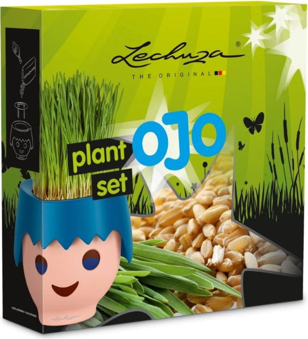 Zestaw zawiera organiczne nasiona trawy pszenicznej, z których wyrasta krzaczasta roślina, będąca świetną fryzurą dla OJO. Dzięki praktycznej podstawce z knotem do podlewania i dołączonemu LECHUZA-PON roślina praktycznie sama o siebie dba.