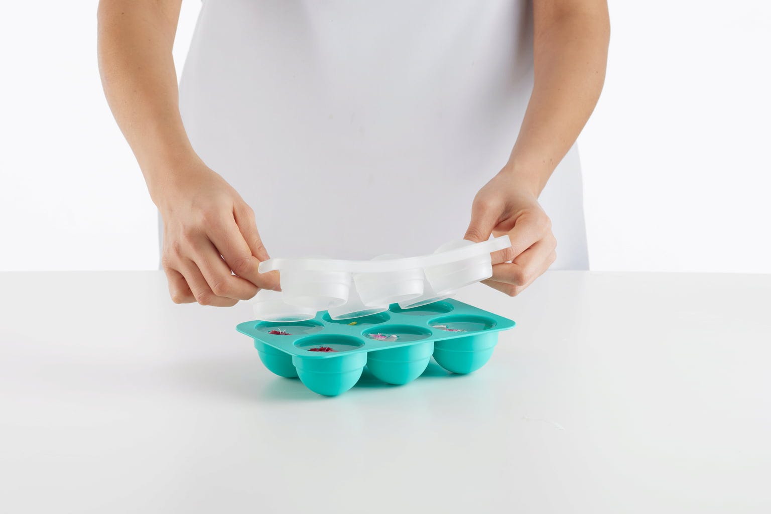 Po prostu napełnij formę po brzegi, umieść platynową silikonową pokrywkę mocno na górze - zapewnia ona nie tylko idealnie uformowane gałki i ochronę przed niepożądanymi zapachami w zamrażarce, ale także umożliwia transport bez kapania do zamrażarki dzięki solidnej podstawie. Gdy tylko lody zostaną zamrożone, gałki przylegają do pokrywki, dzięki czemu wyjmowanie jest dziecinnie proste: wystarczy oddzielić pokrywkę od podstawy i bez wysiłku uwolnić gałki lodów.