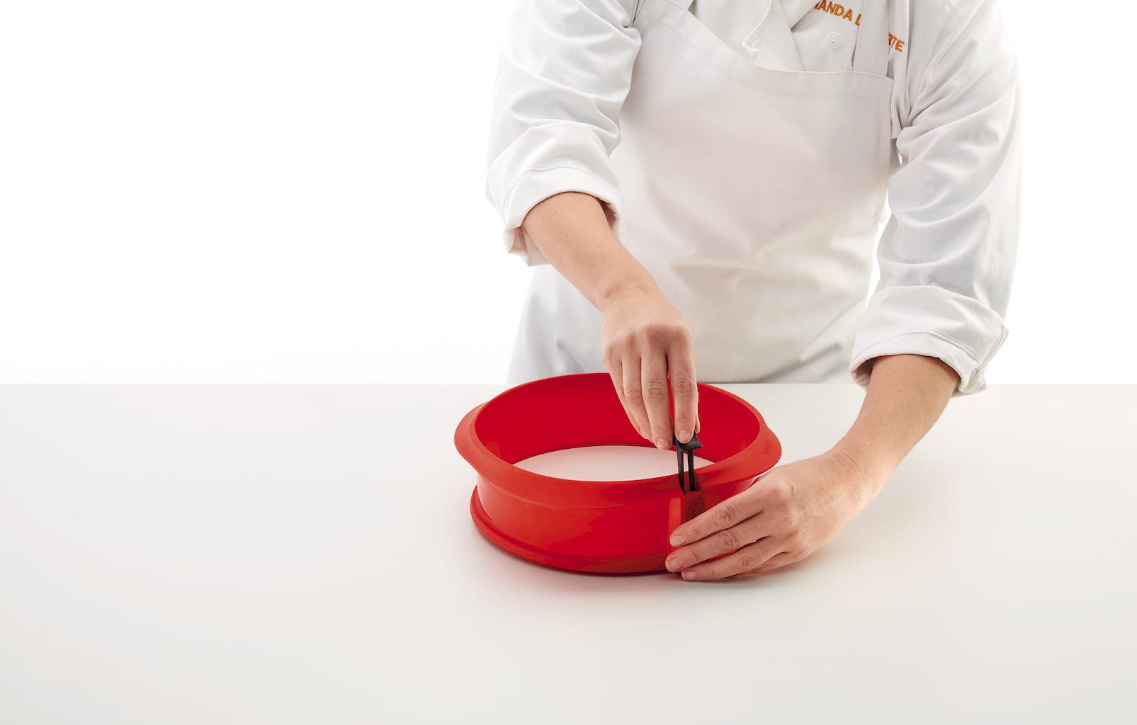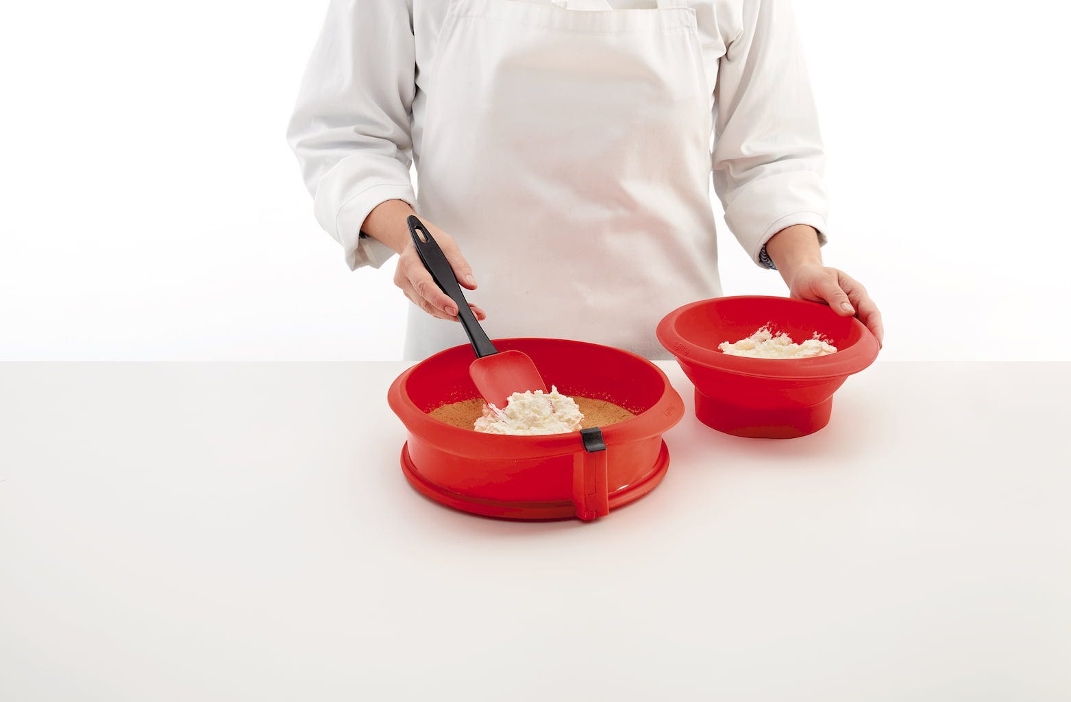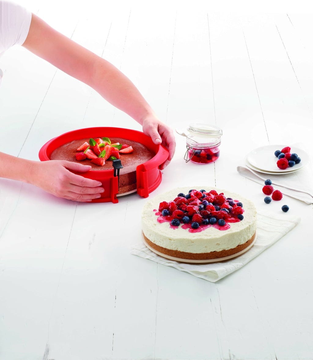 Najważniejszym elementem tej formy jest połączenie elastycznego, nieprzywierającego silikonowego pierścienia i wytrzymałej ceramicznej podstawy. Dzięki praktycznemu systemowi zamykania na zatrzask, silikonowy pierścień można łatwo i bezpiecznie zamknąć wokół talerza, dzięki czemu nic nie przecieka podczas pieczenia - idealny nawet do najbardziej delikatnych ciast. Po upieczeniu można bez wysiłku otworzyć blokadę, silikonowy pierścień delikatnie odłącza się od ciasta, a Twoje arcydzieło jest idealnie uformowane i gotowe do podania na atrakcyjnej, odpornej na zarysowania i żaroodpornej płycie ceramicznej.