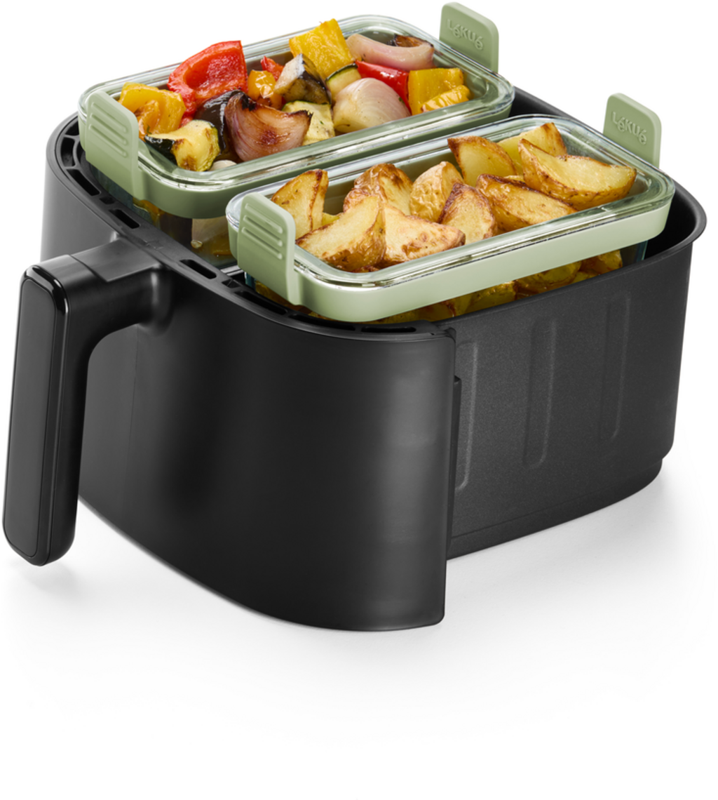 Te sprytne, wszechstronne pojemniki wykonane z wytrzymałego szkła borokrzemowego są nie tylko idealne do przygotowywania różnych potraw w tym samym czasie we frytkownicy powietrznej, ale mogą być również używane w piekarniku lub kuchence mikrofalowej.